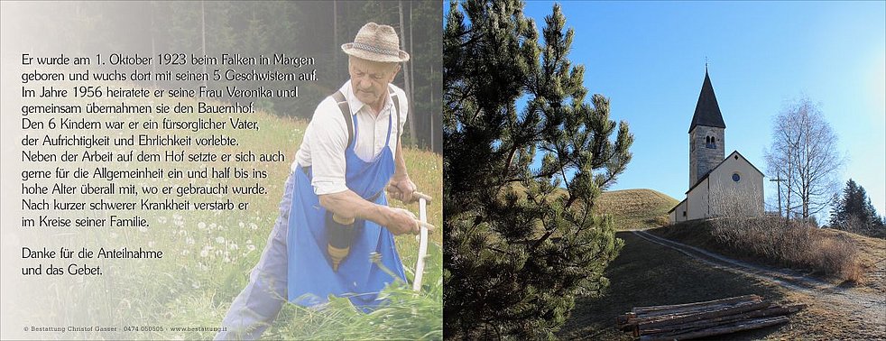 13.45 Uhr von der Margener Kirche ausgehend, auf seinem letzten Weg zum Abschiedsgottesdienst um 15 Uhr in die Pfarrkirche von Terenten und anschließend zur letzten Ruhe in den Ortsfriedhof.