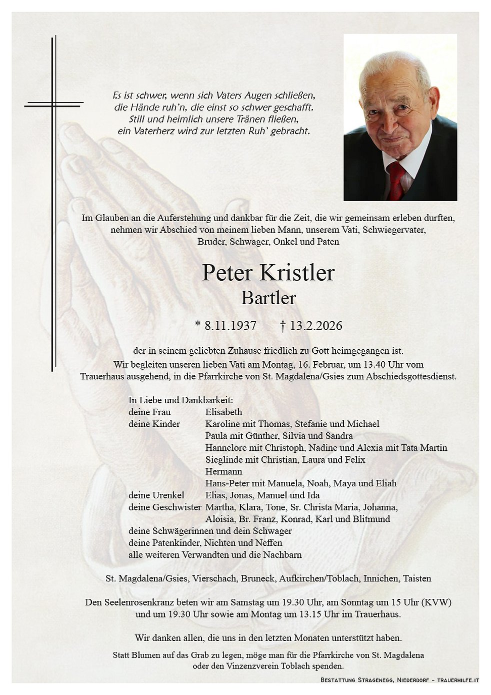 I wünsch enk olla, bsundos dir Silvi, in di Buibn, Sandra und Paula, mein herzlichis Beileid!
