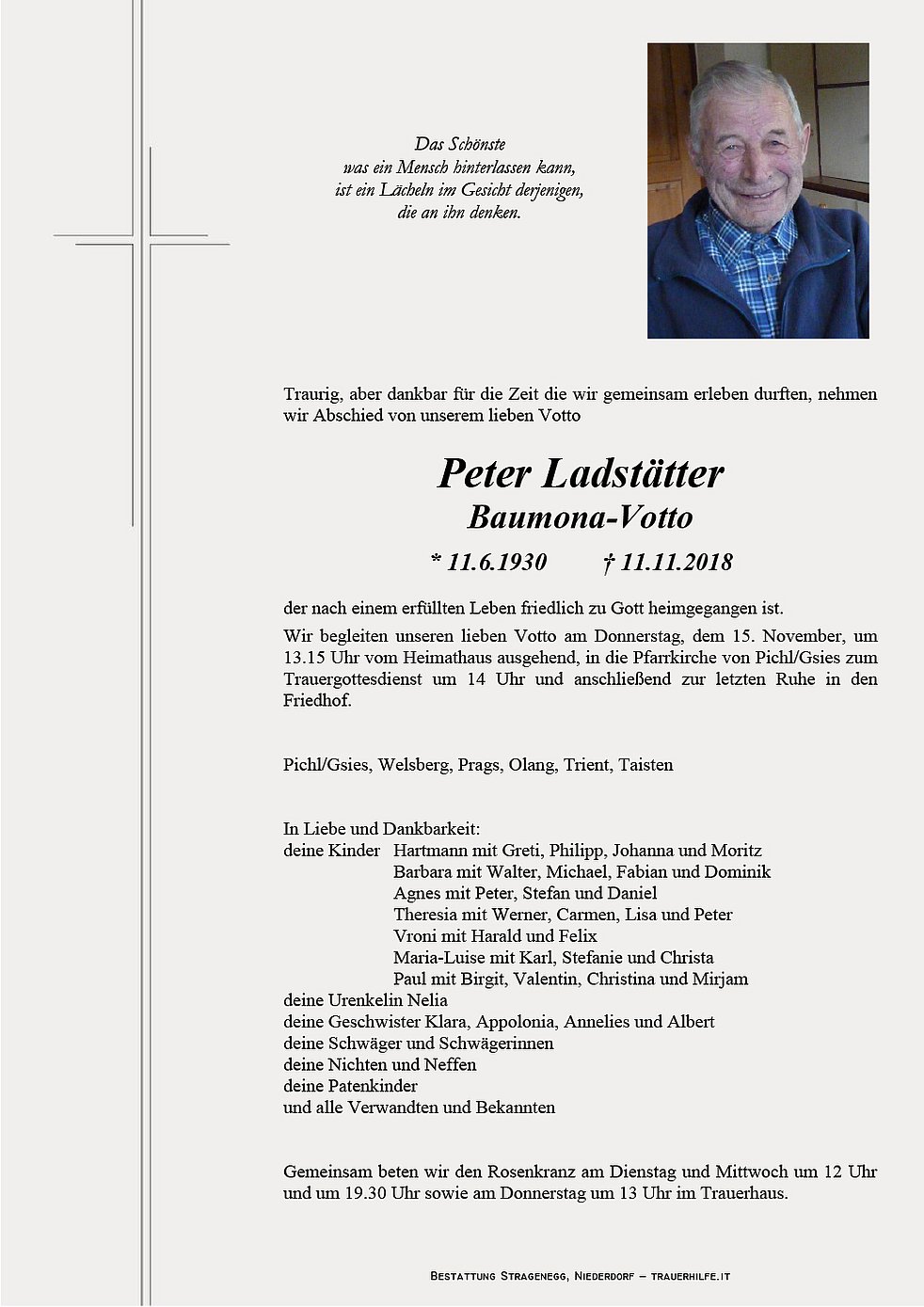 Wir begleiten unseren lieben Votto am Donnerstag, dem 15. November, um 13.15 Uhr vom Heimathaus ausgehend, in die Pfarrkirche von Pichl/Gsies zum Trauergottesdienst um 14 Uhr und anschließend zur letzten Ruhe in den Friedhof.