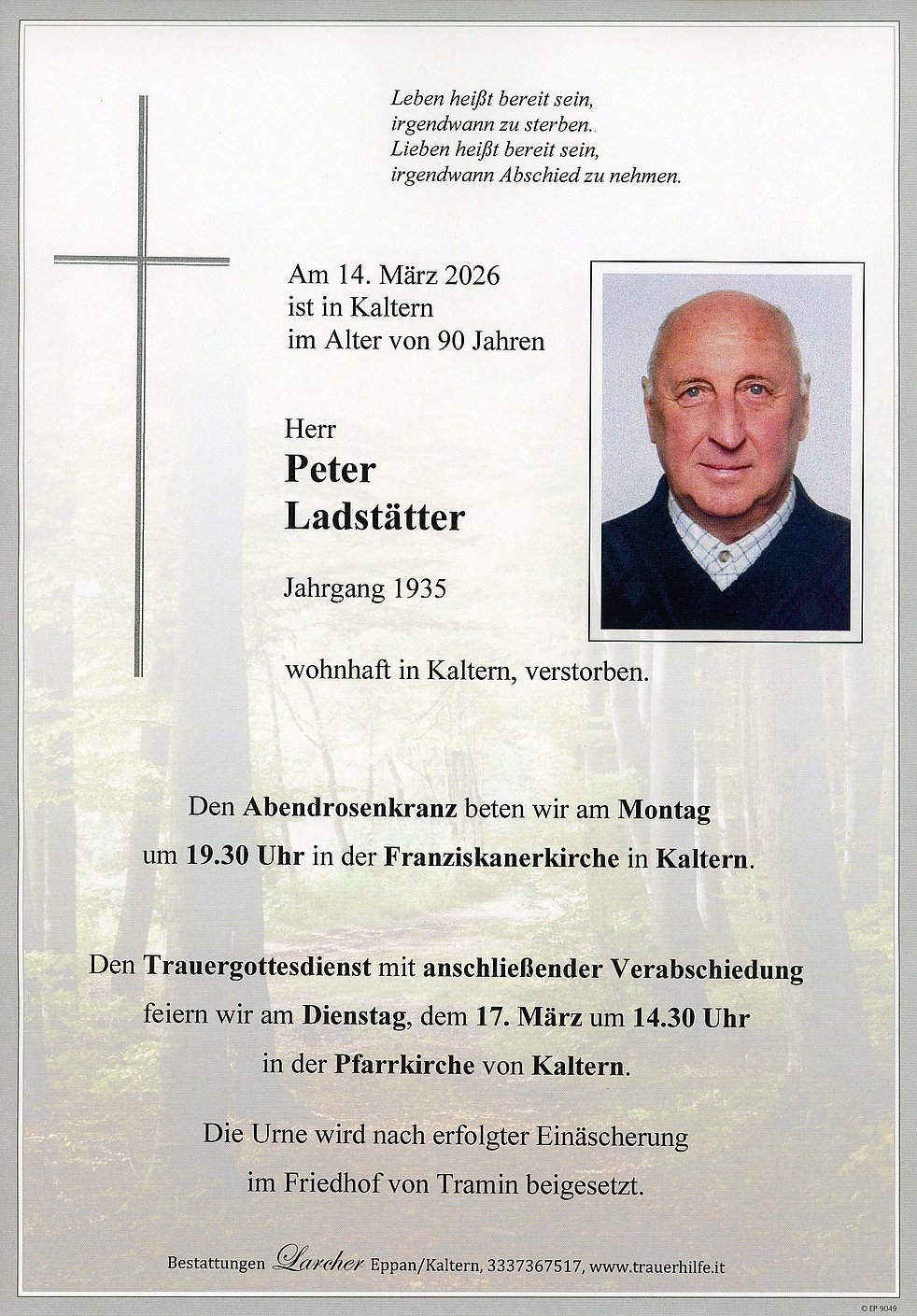 Den Trauergottesdienst mit anschließender Verabschiedung feiern wir am Dienstag, 17. März um 14.30 Uhr in der Pfarrkirche von Kaltern. Die Urne wird zu einem späteren Zeitpunkt im Friedhof von Tramin beigesetzt.