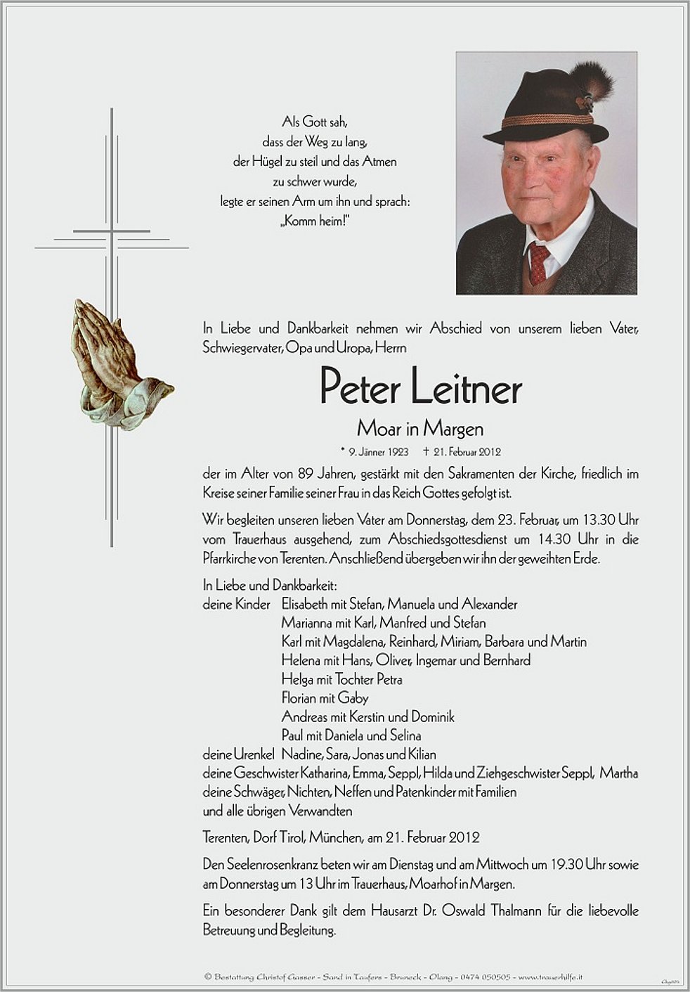 Wir begleiten unseren lieben Vater am Donnerstag, dem 23. Februar, um 13.30 Uhr vom Trauerhaus ausgehend, zum Abschiedsgottesdienst um 14.30 Uhr in die Pfarrkirche von Terenten. Anschließend übergeben wir ihn der geweihten Erde.