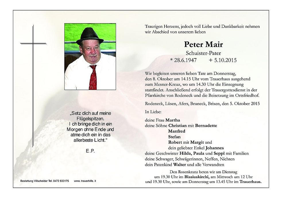 zum Mesner-Kreuz, wo um 14.30 Uhr die Einsegnung stattfindet. Anschließend erfolgt der Trauergottesdienst in der Pfarrkirche von Rodeneck und die Beisetzung im Ortsfriedhof.