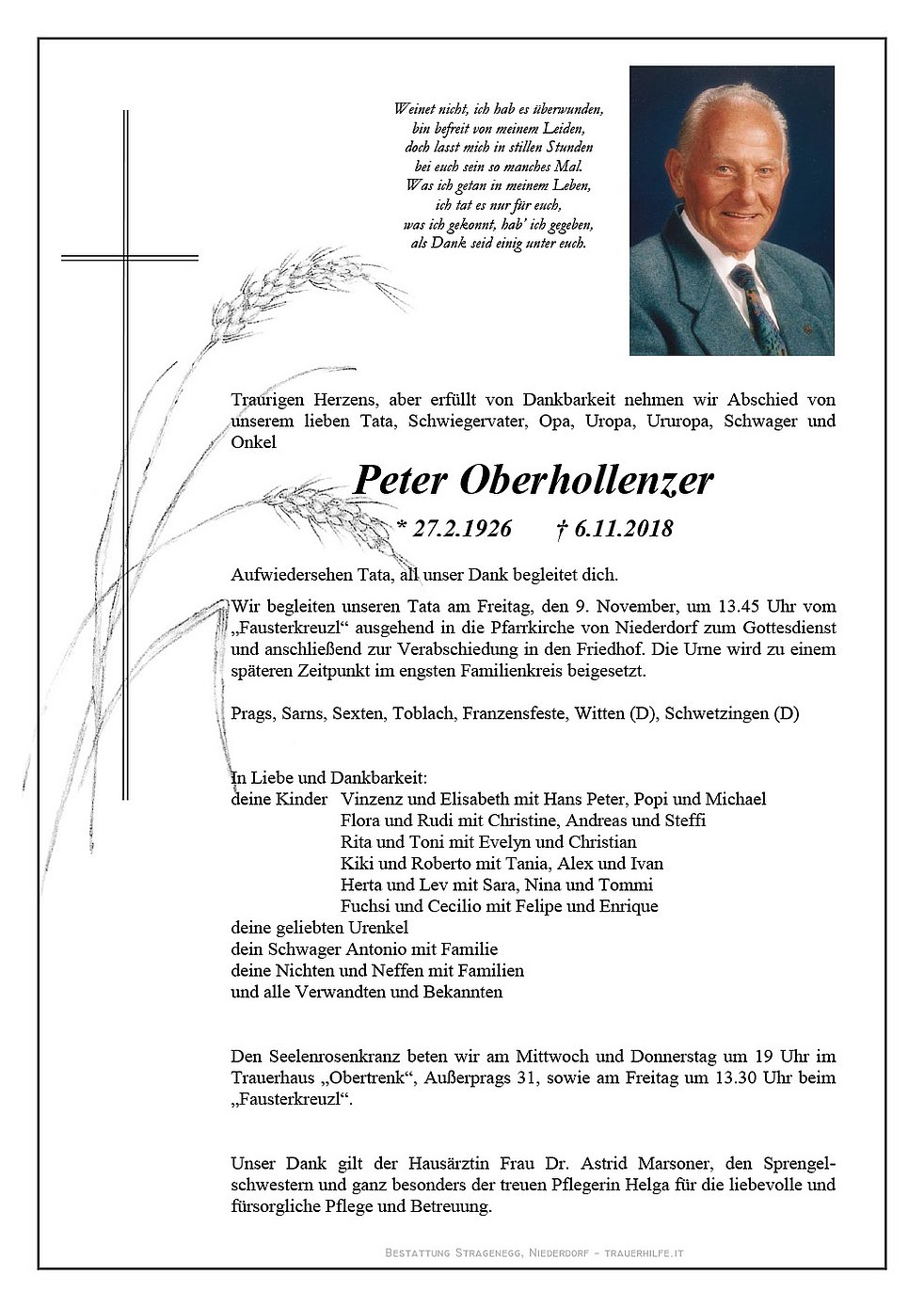 Wir begleiten unseren Tata am Freitag, den 9. November, um 13.45 Uhr vom „Fausterkreuzl“ ausgehend in die Pfarrkirche von Niederdorf zum Gottesdienst und anschließend zur Verabschiedung in den Friedhof. Die Urne wird zu einem späteren Zeitpunkt im engsten Familienkreis beigesetzt.