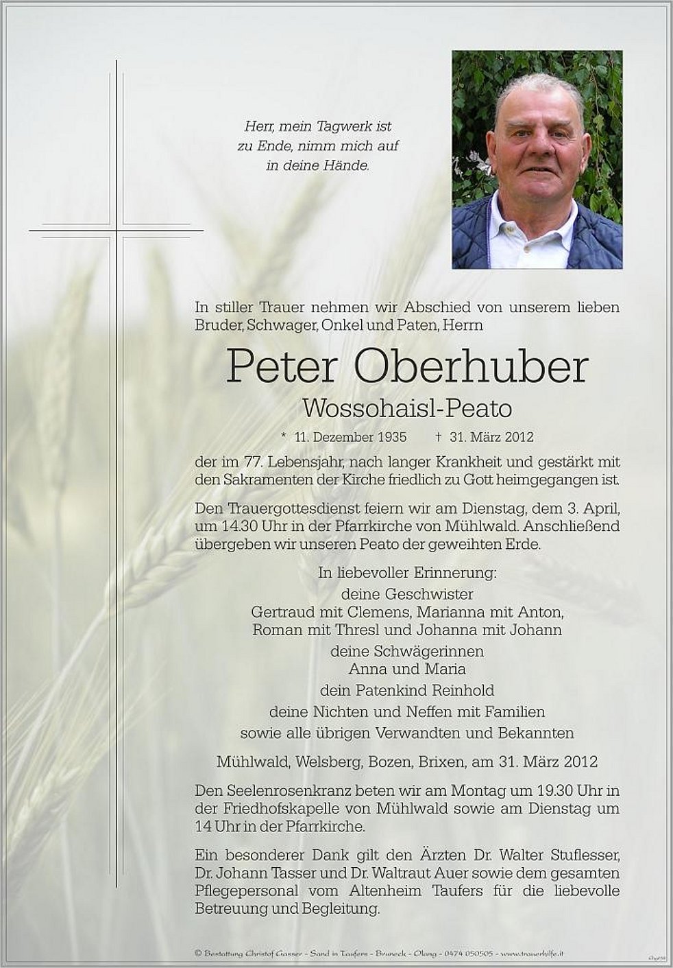 Den Trauergottesdienst feiern wir am Dienstag, dem 3. April, um 14.30 Uhr in der Pfarrkirche von Mühlwald. Anschließend übergeben wir unseren Peato der geweihten Erde.