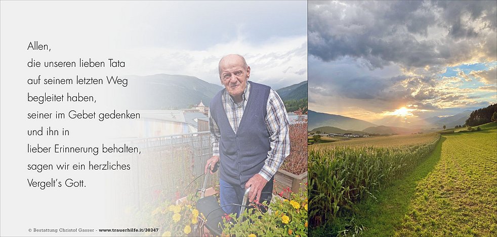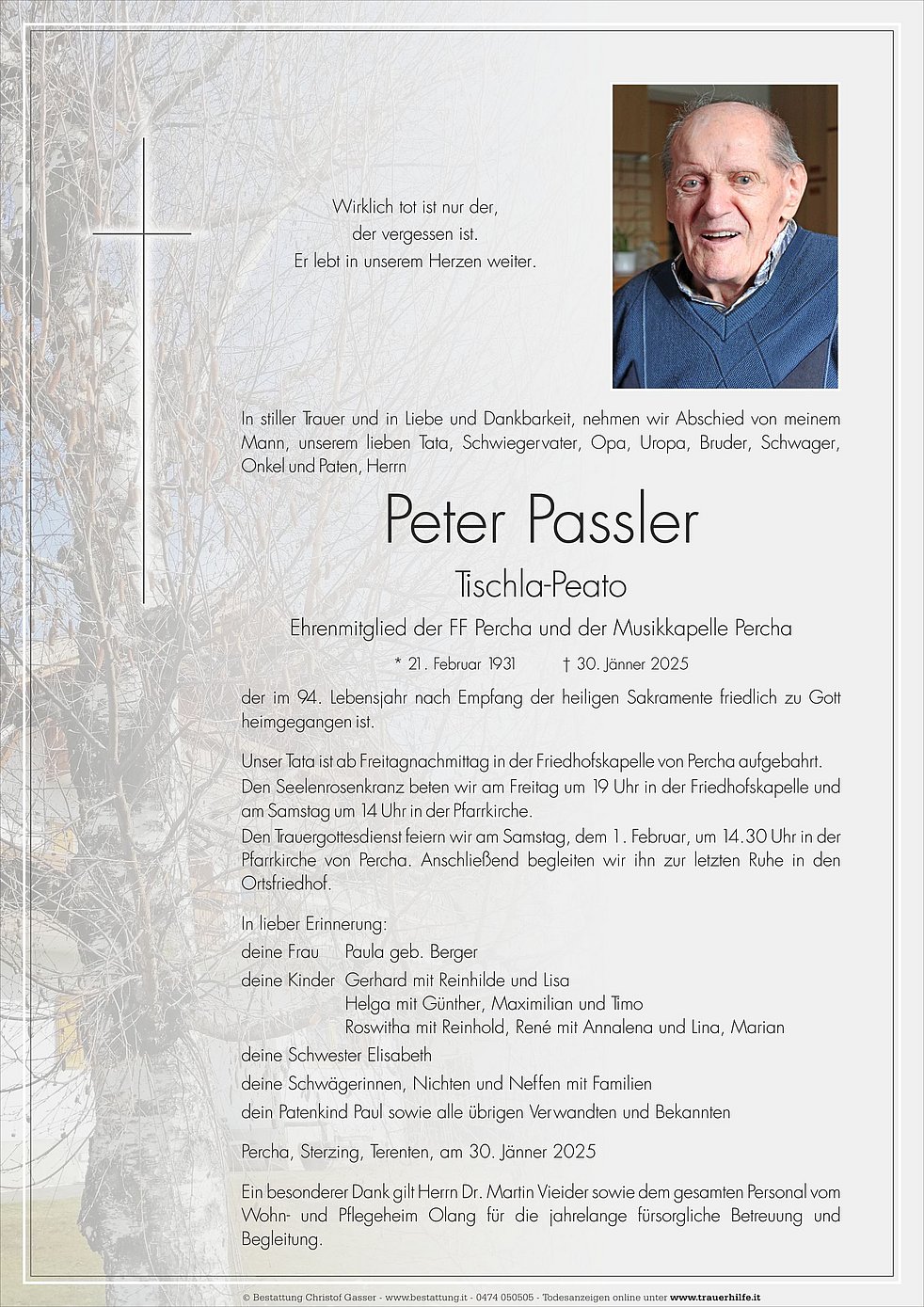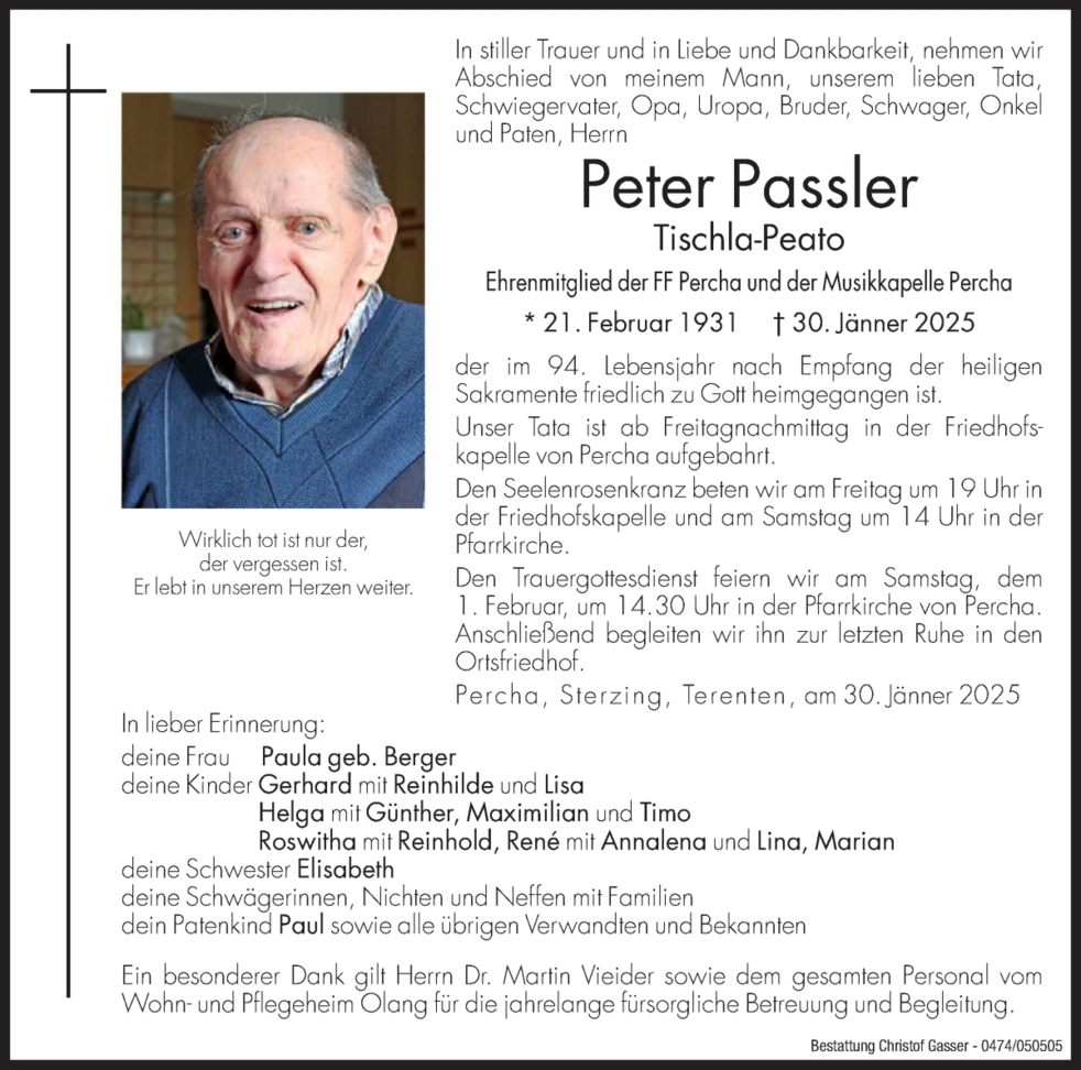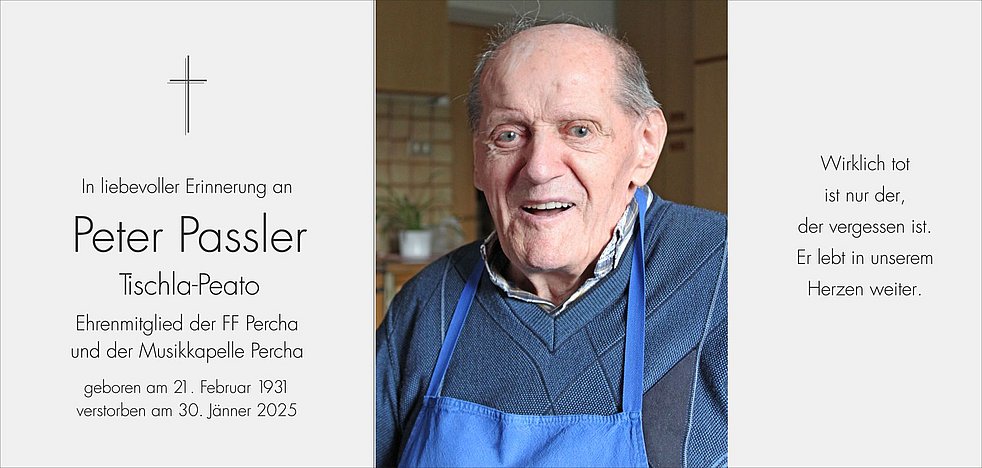 Den Trauergottesdienst feiern wir am Samstag, dem 1. Februar, um 14.30 Uhr in der Pfarrkirche von Percha. Anschließend begleiten wir ihn zur letzten Ruhe in den Ortsfriedhof.