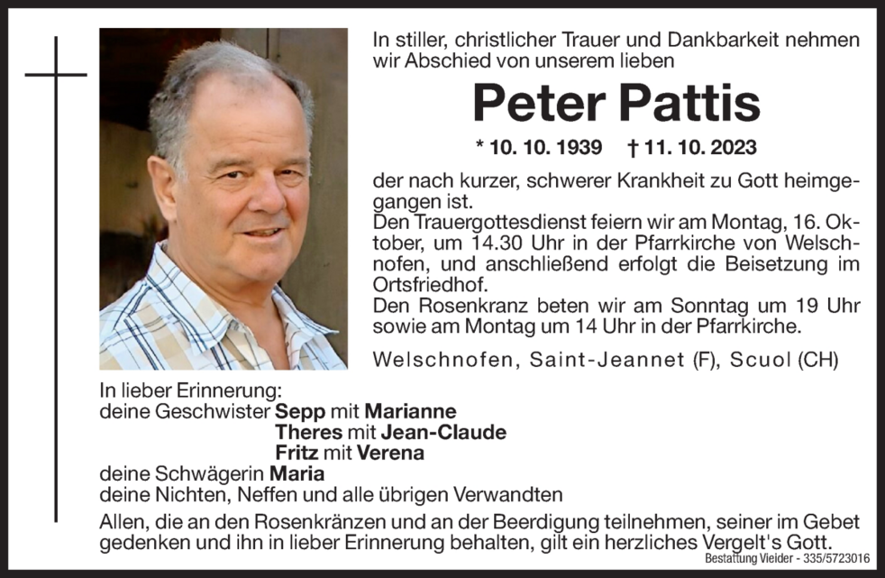 Den Trauergottesdienst feiern wir am Montag, 16. Oktober um 14.30 Uhr in der Pfarrkirche von Welschnofen und anschließend erfolgt die Beisetzung im Ortsfriedhof.