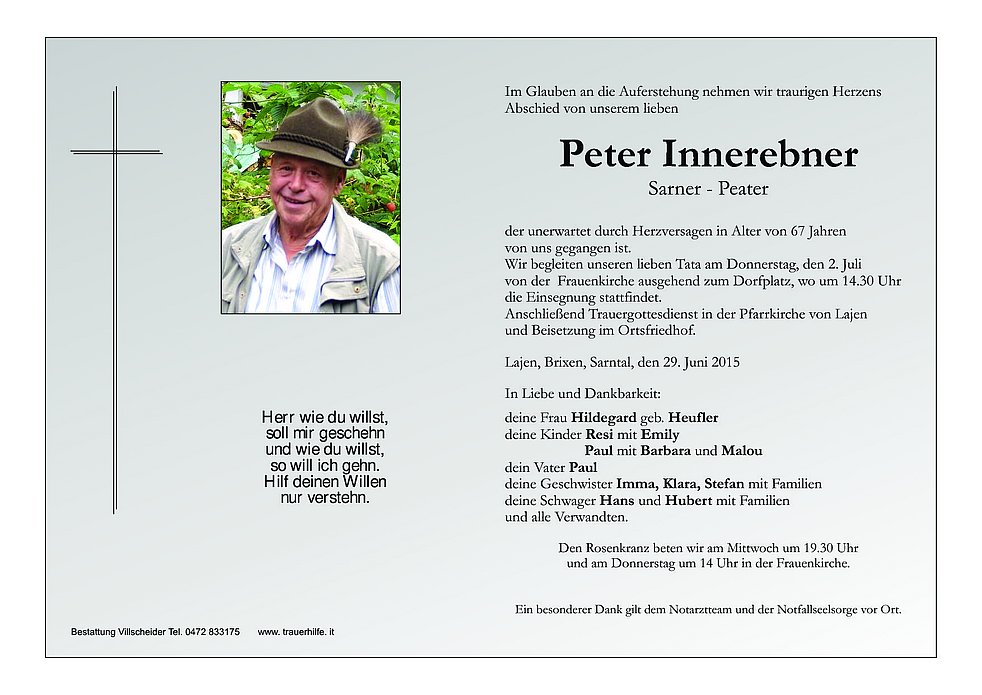 Ein herzliches Beileid ,der Familie Innerebner.entbietet Scola Franz,Walli,Karin und Julia.Ruhe in Frieden ,mein Freind Peter!
