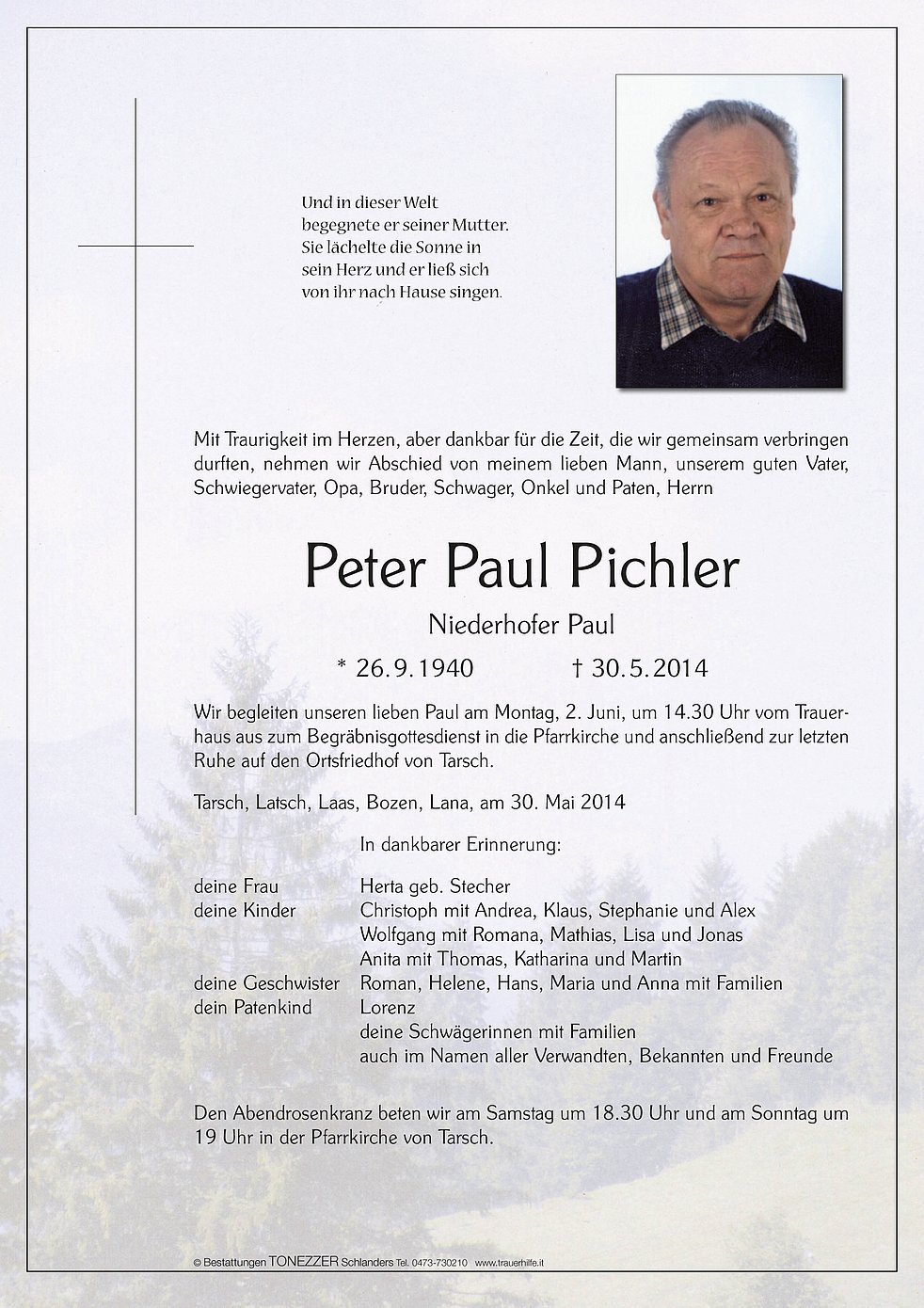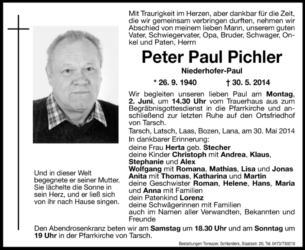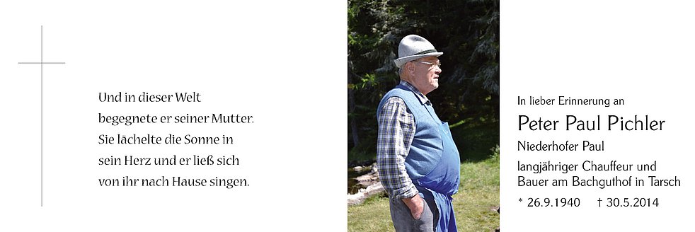Wir begleiten unseren lieben Paul am Montag, 2. Juni, um 14.30 Uhr vom Trauerhaus aus zum Begräbnisgottesdienst in die Pfarrkirche und anschließend zur letzten Ruhe auf den Ortsfriedhof von Tarsch.