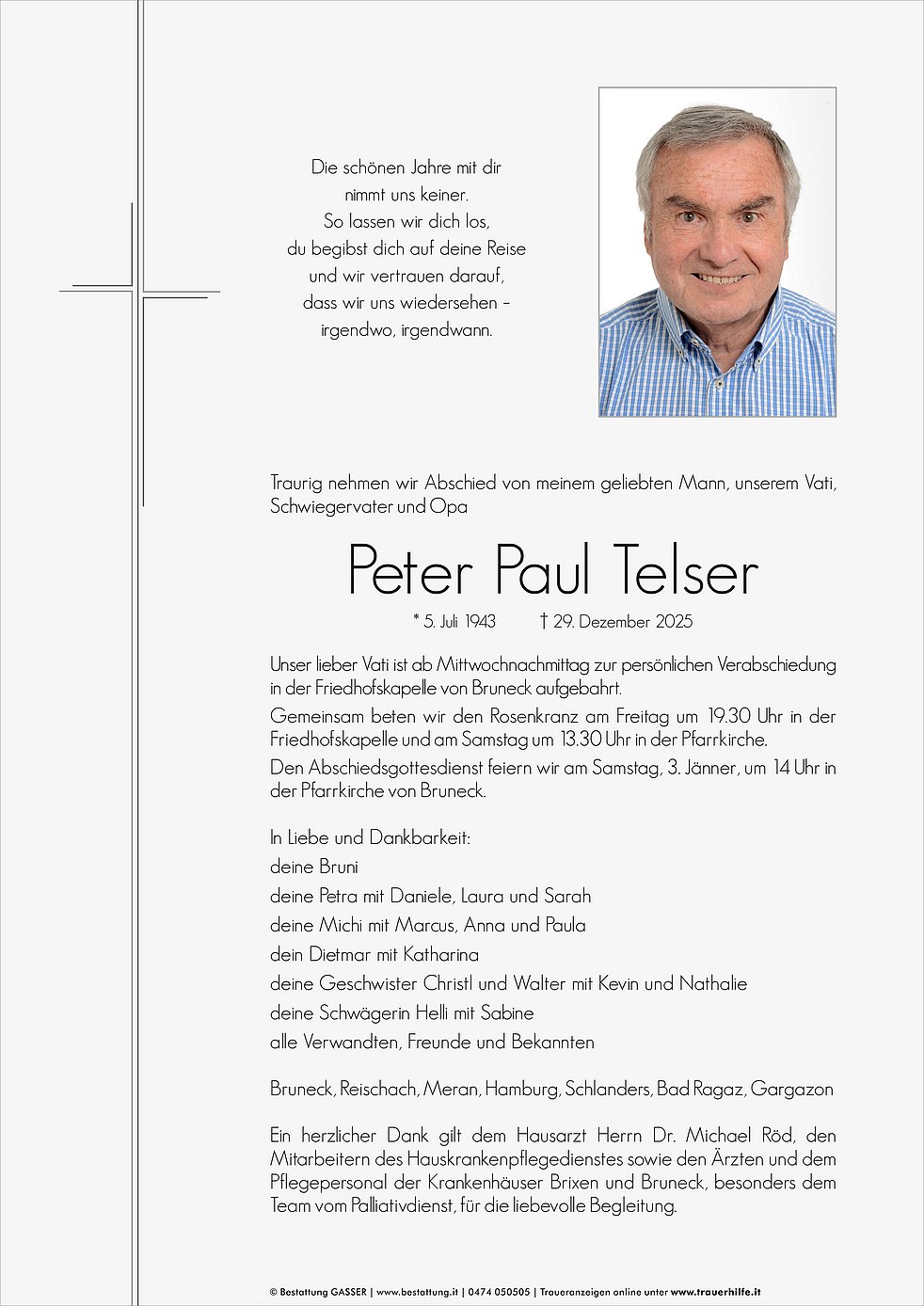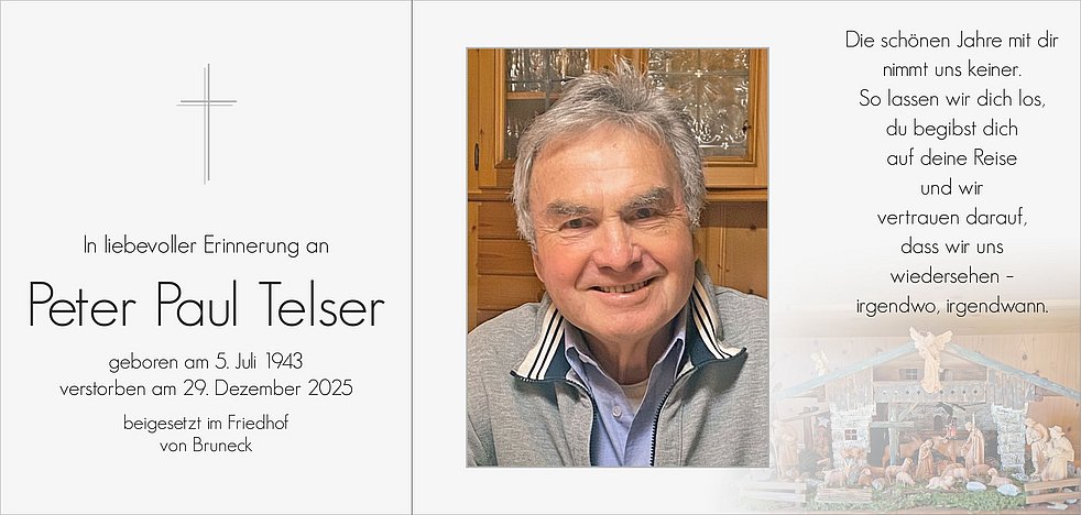 Unser lieber Vati ist ab Mittwochnachmittag zur persönlichen Verabschiedung in der Friedhofskapelle von Bruneck aufgebahrt.