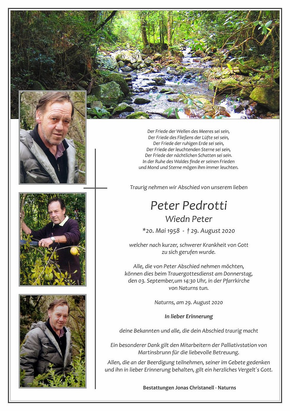Alle, die von Peter Abschied nehmen möchten, können dies beim Trauergottesdienst am Donnerstag, den 03. September,um 14:30 Uhr, in der Pfarrkirche von Naturns tun.