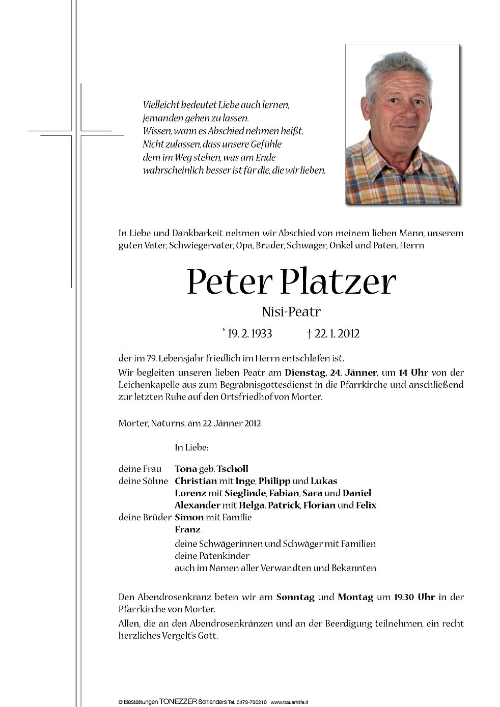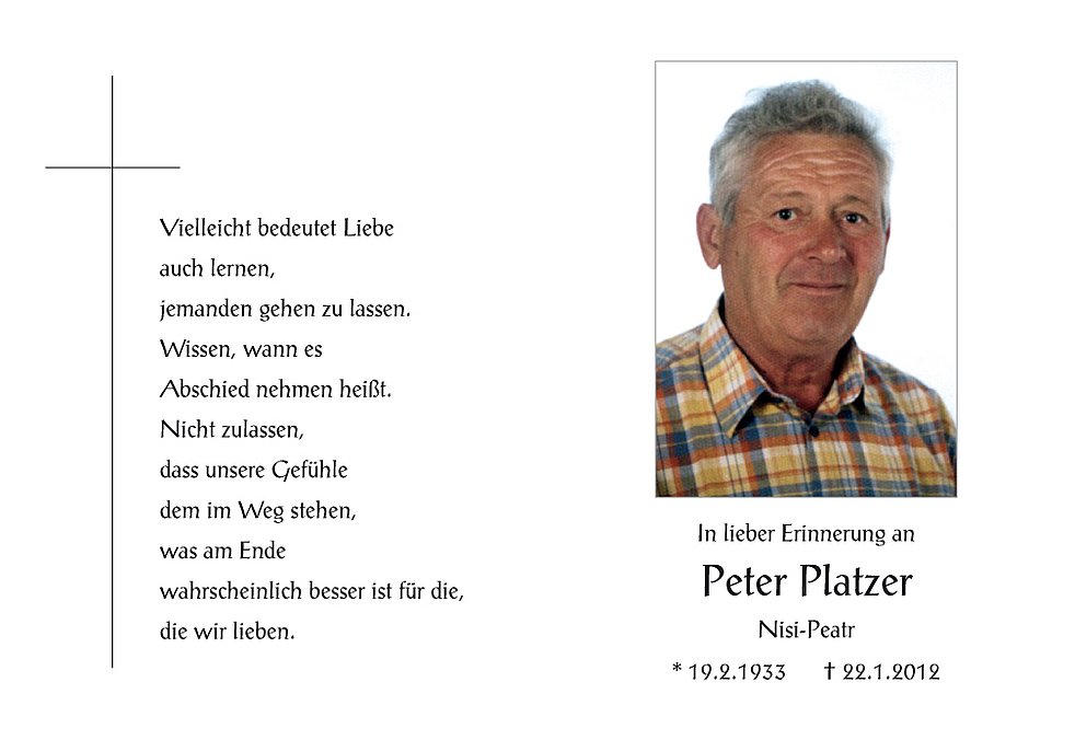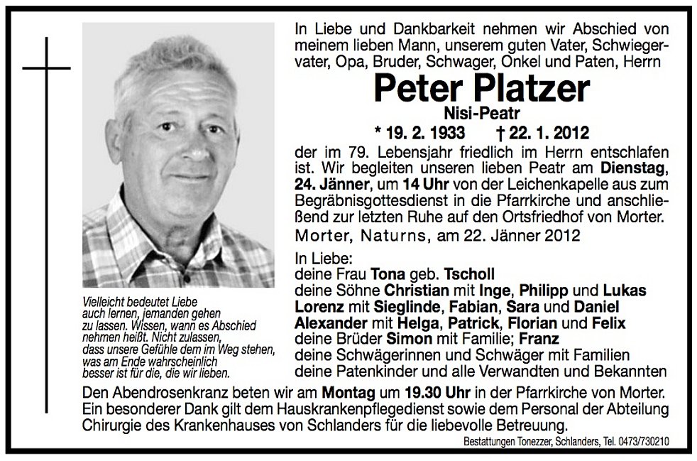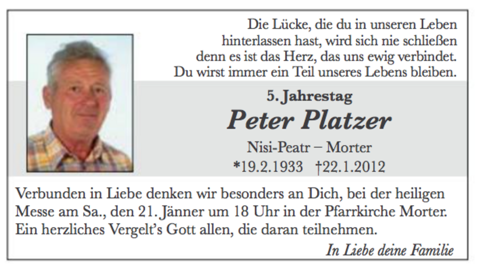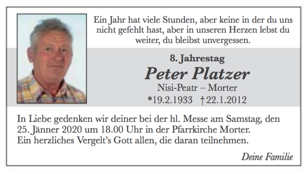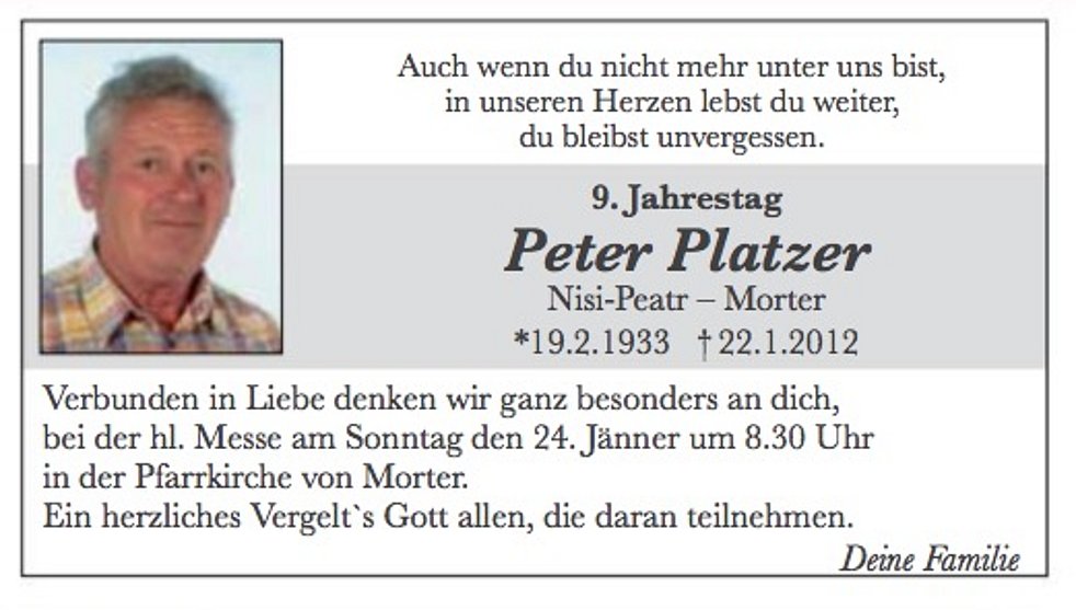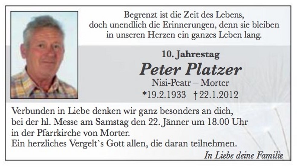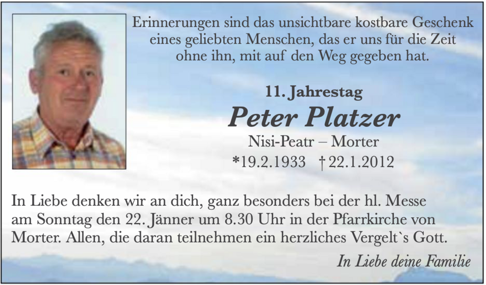 Wir begleiten unseren lieben Peatr am Dienstag, 24. Jänner, um 14 Uhr von der Leichenkapelle aus zum Begräbnisgottesdienst in die Pfarrkirche und anschließend zur letzten Ruhe auf den Ortsfriedhof von Morter.