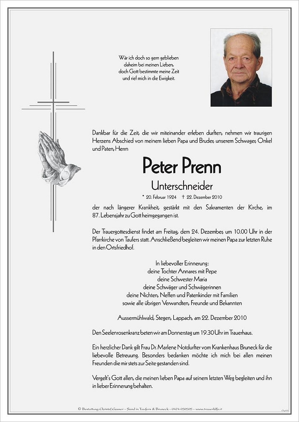 Der Trauergottesdienst findet am Freitag, dem 24. Dezember, um 10.00 Uhr in der Pfarrkirche von Taufers statt. Anschließend begleiten wir meinen Papa zur letzten Ruhe in den Ortsfriedhof.
