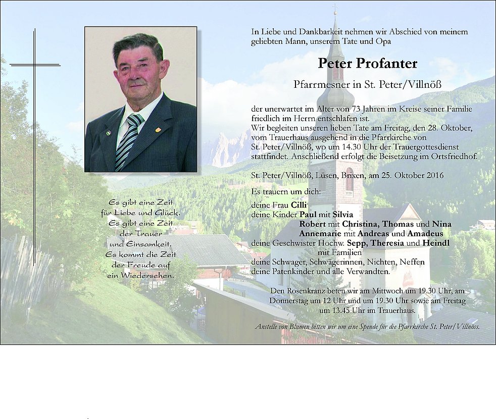 Anstelle von Blumen bitten wir um eine Spende für die Pfarrkirche St. Peter/Villnöss.