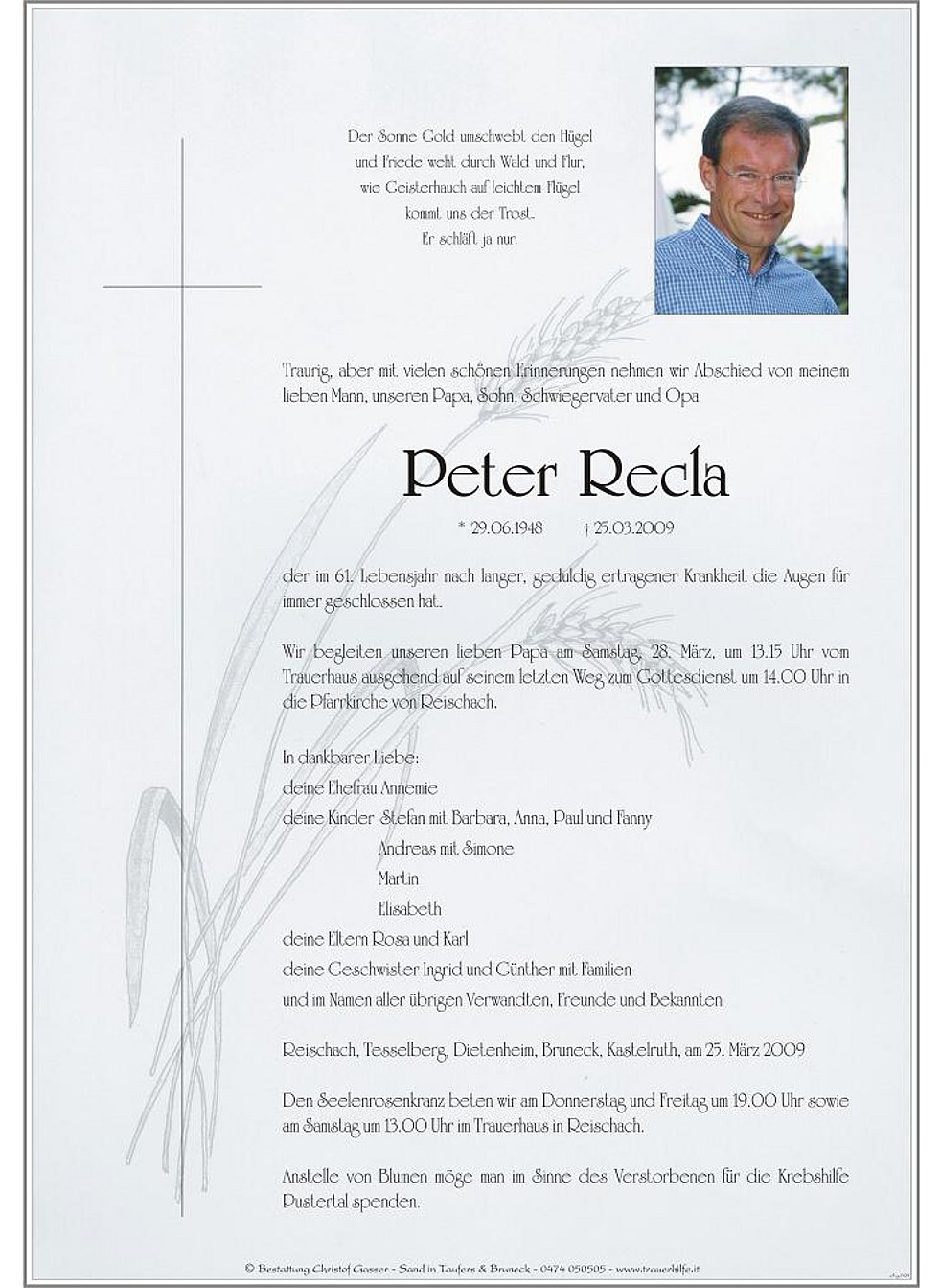 Anstelle von Blumen möge man im Sinne des Verstorbenen für die Krebshilfe Pustertal spenden.