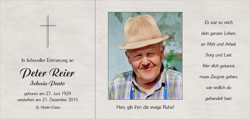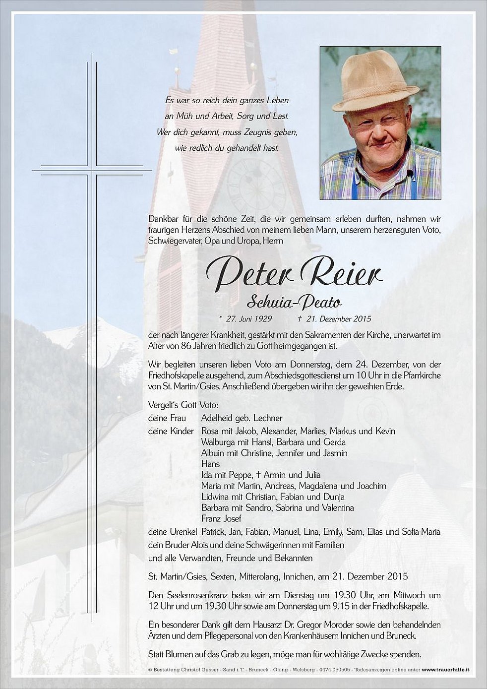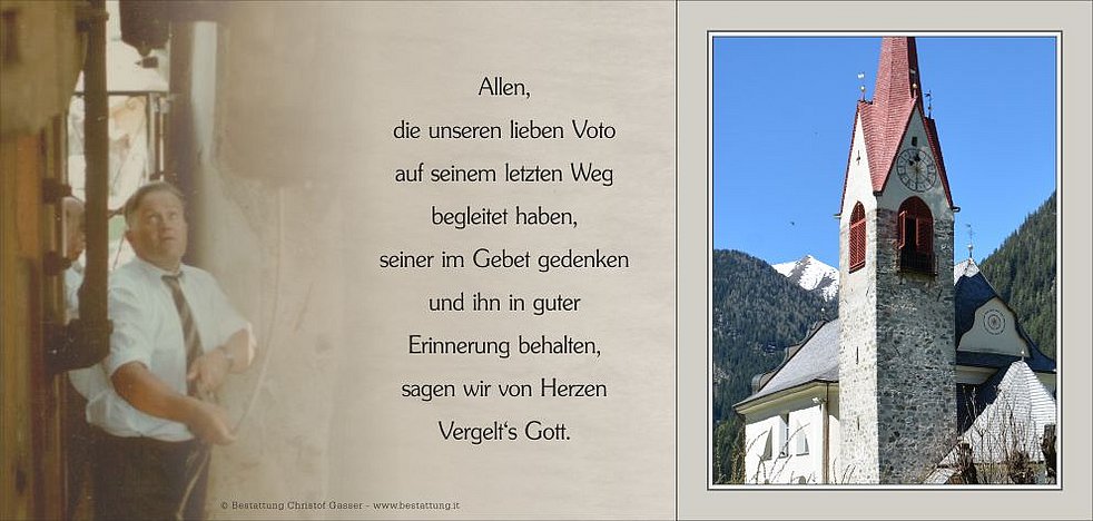 Wir begleiten unseren lieben Voto am Donnerstag, dem 24. Dezember, von der Friedhofskapelle ausgehend, zum Abschiedsgottesdienst um 10 Uhr in die Pfarrkirche von St. Martin/Gsies. Anschließend übergeben wir ihn der geweihten Erde.