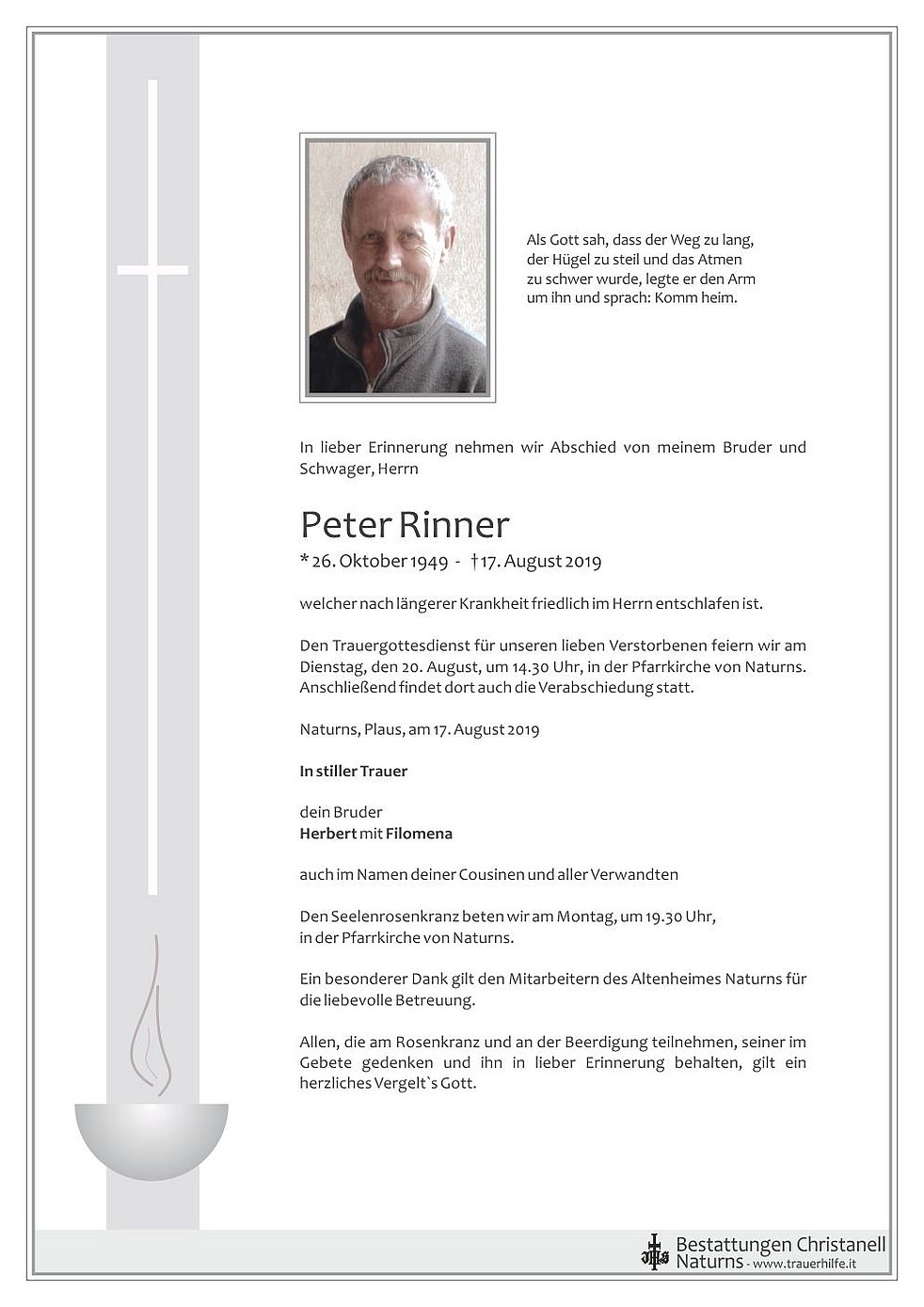 Den Trauergottesdienst für unseren lieben Verstorbenen feiern wir am Dienstag, den 20. August, um 14.30 Uhr, in der Pfarrkirche von Naturns. Anschließend findet dort auch die Verabschiedung statt.