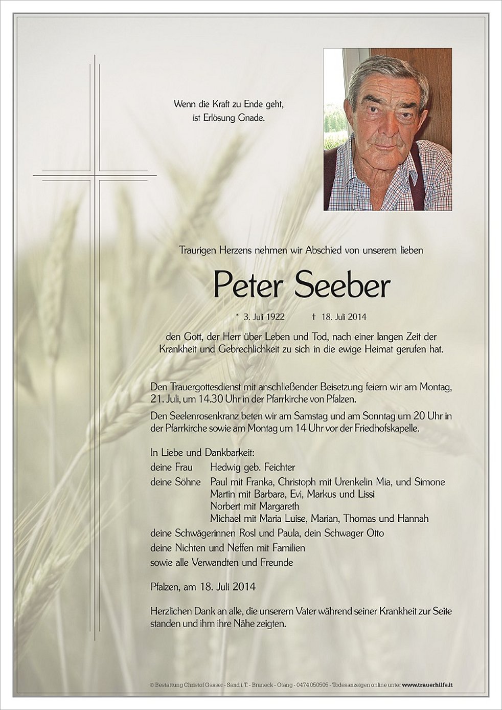 Den Trauergottesdienst mit anschließender Beisetzung feiern wir am Montag, 21. Juli, um 14.30 Uhr in der Pfarrkirche von Pfalzen.