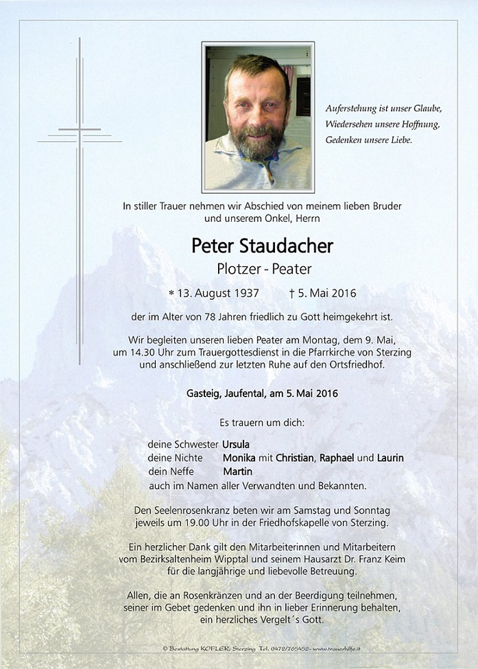 Wir begleiten unseren lieben Peater am Montag, dem 9. Mai, um 14.30 Uhr zum Trauergottesdienst in die Pfarrkirche von Sterzing