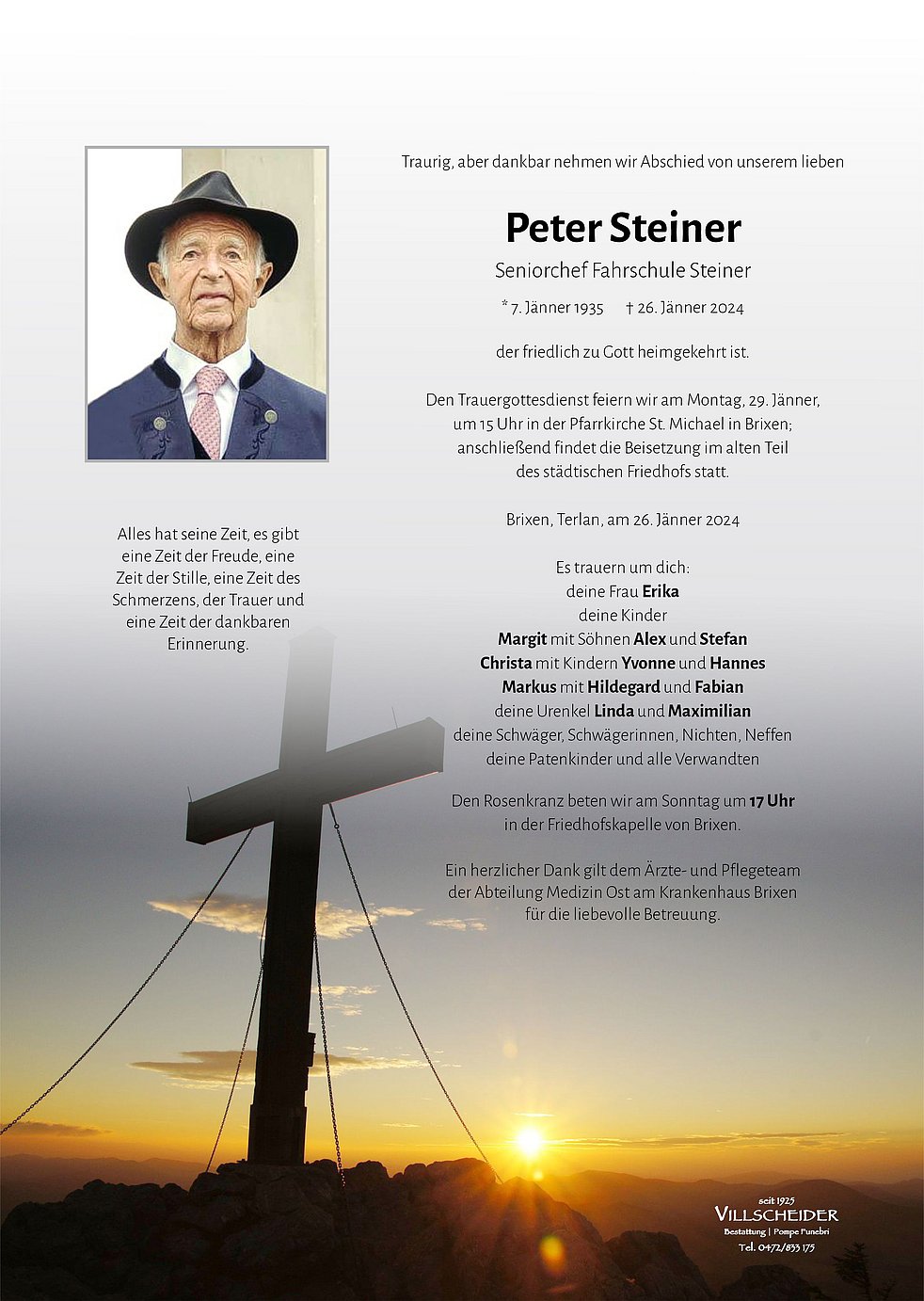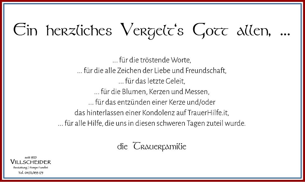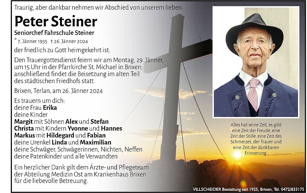Begräbnisgottesdienst: 29.01. - 15:00 Uhr Brixen