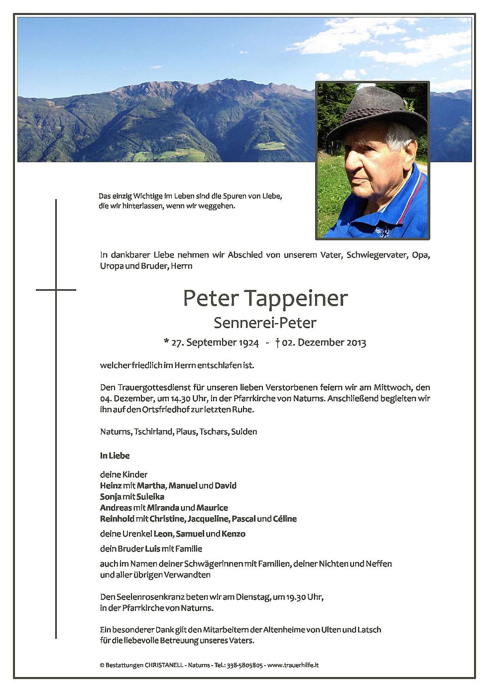 Den Trauergottesdienst für unseren lieben Verstorbenen feiern wir am Mittwoch, den 04. Dezember, um 14.30 Uhr, in der Pfarrkirche von Naturns. Anschließend begleiten wir ihn auf den Ortsfriedhof zur letzten Ruhe.