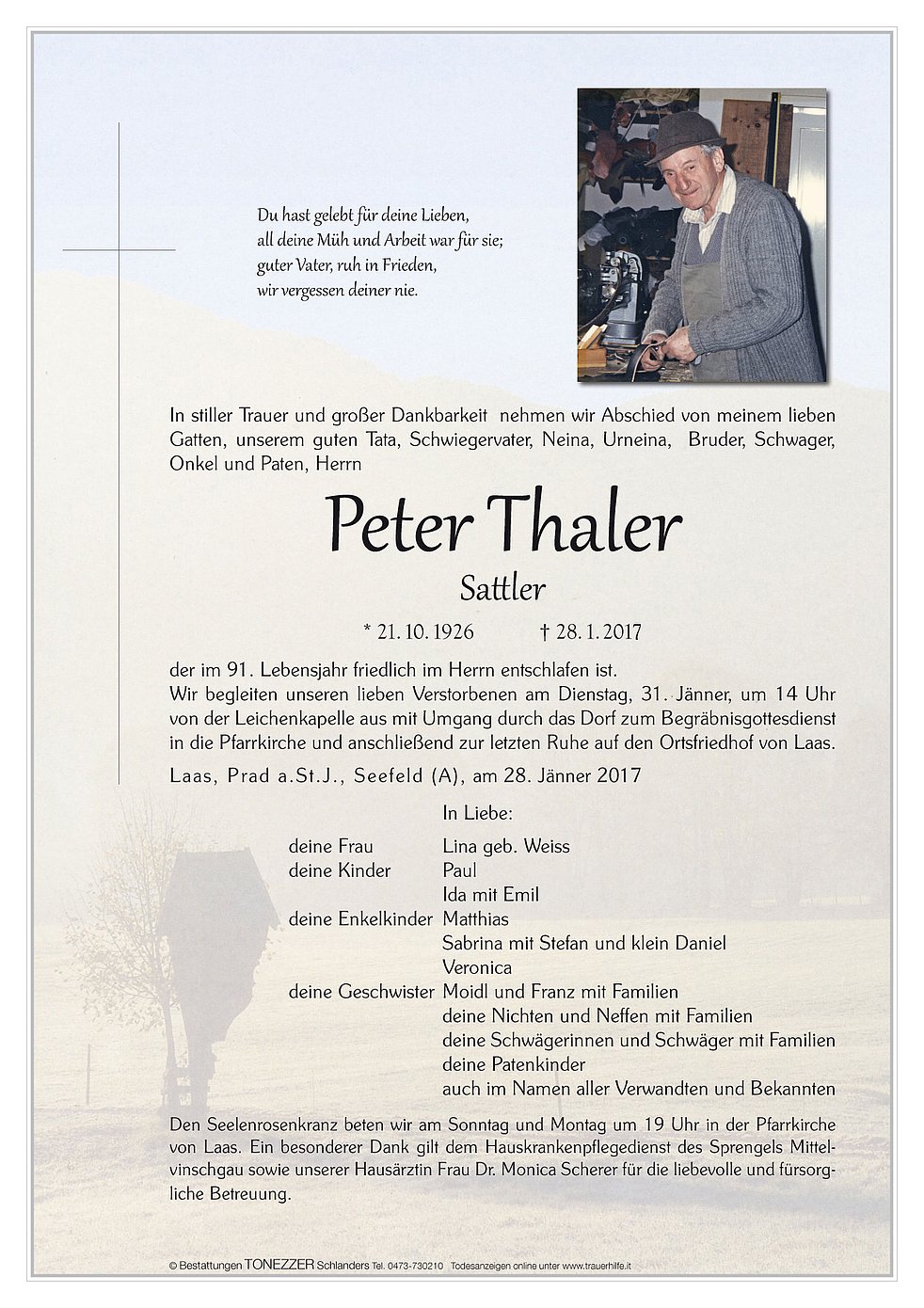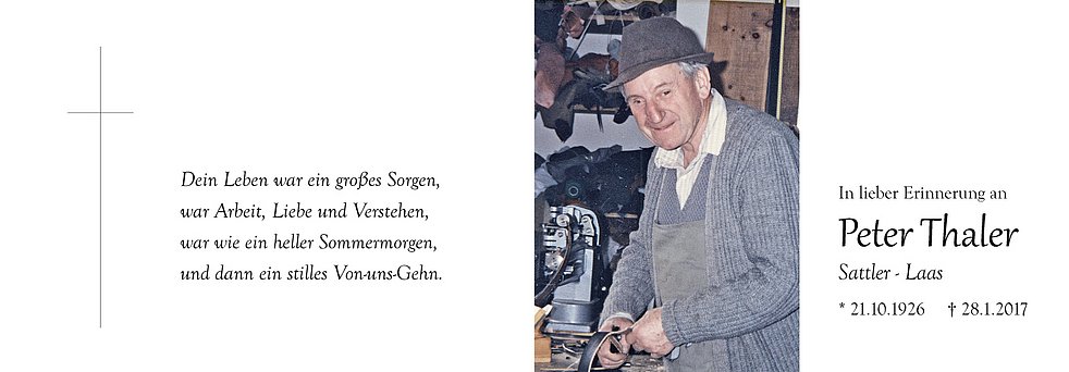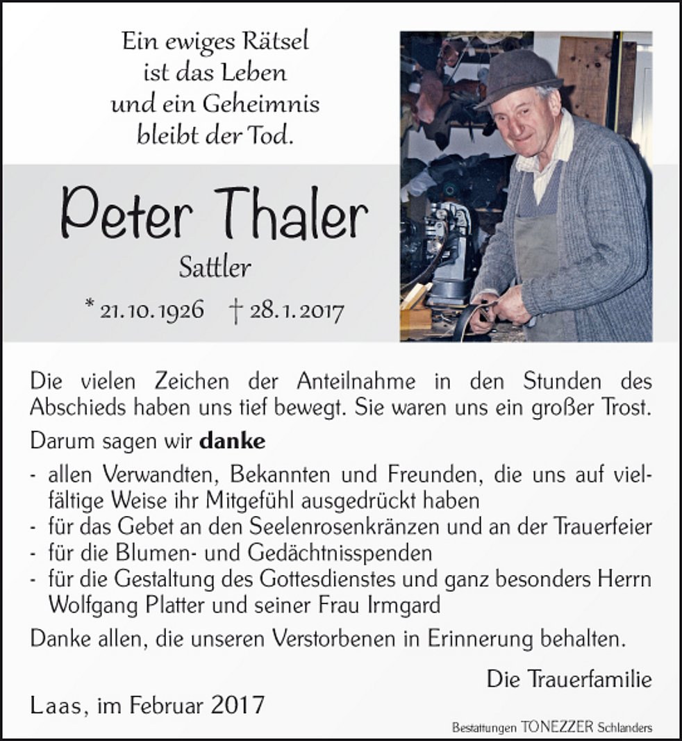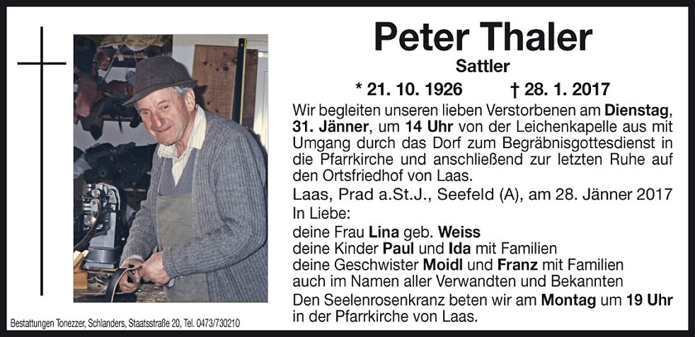 Wir begleiten unseren lieben Verstorbenen am Dienstag, 31. Jänner, um 14 Uhr von der Leichenkapelle aus mit Umgang durch das Dorf zum Begräbnisgottesdienst in die Pfarrkirche und anschließend zur letzten Ruhe auf den Ortsfriedhof von Laas.