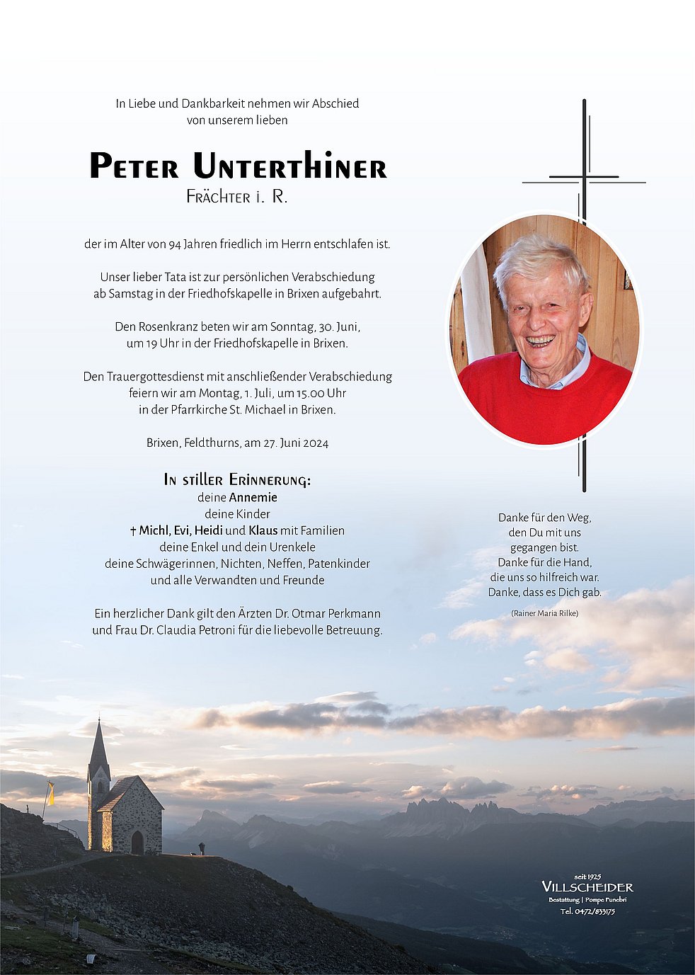 Begräbnisgottesdienst: 01.07. - 15:00 Uhr Brixen