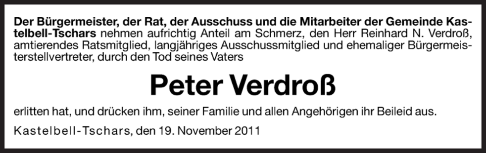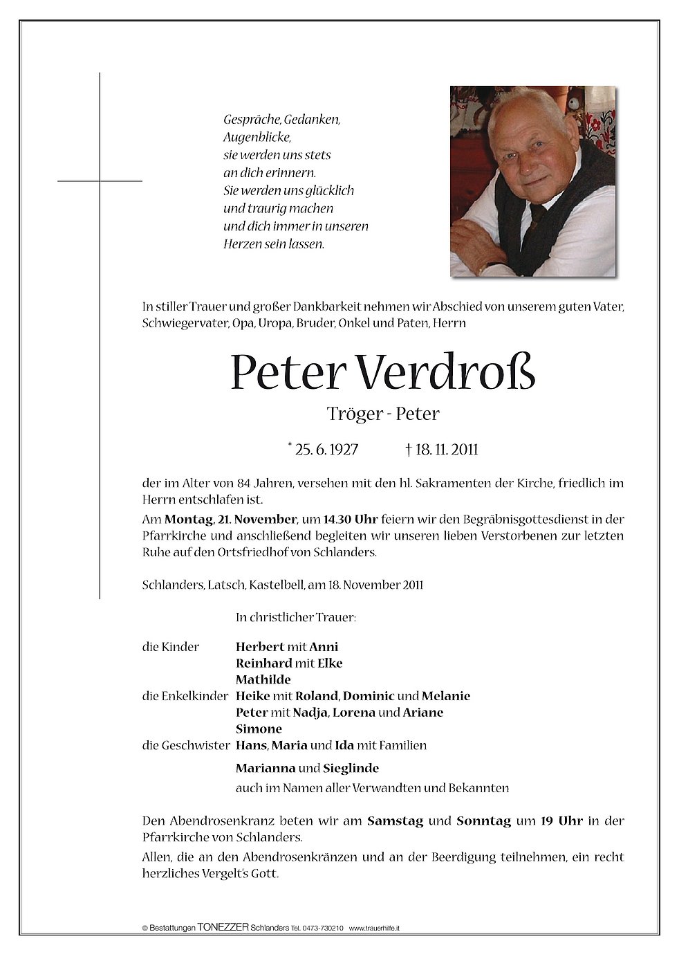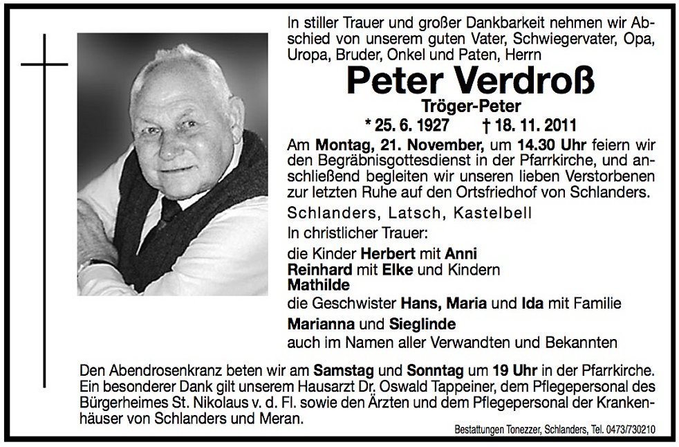 Am Montag, 21. November, um 14.30 Uhr feiern wir den Begräbnisgottesdienst in der Pfarrkirche und anschließend begleiten wir unseren lieben Verstorbenen zur letzten Ruhe auf den Ortsfriedhof von Schlanders.