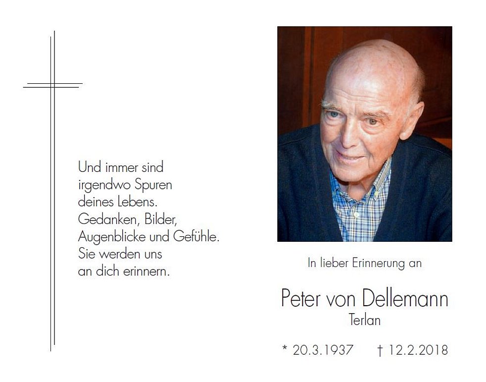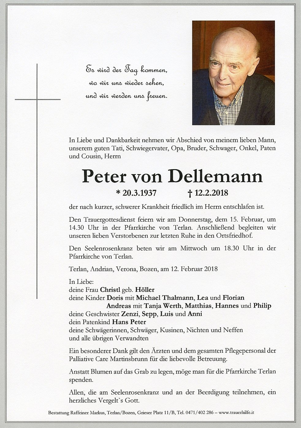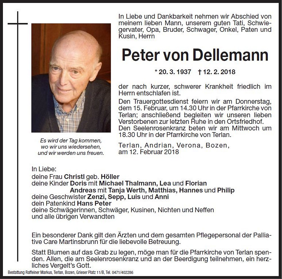 Den Trauergottesdienst feiern wir am Donnerstag, dem 15. Februar, um 14.30 Uhr in der Pfarrkirche von Terlan. Anschließend begleiten wir unseren lieben Verstorbenen zur letzten Ruhe in den Ortsfriedhof.