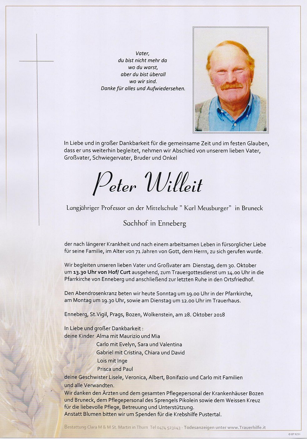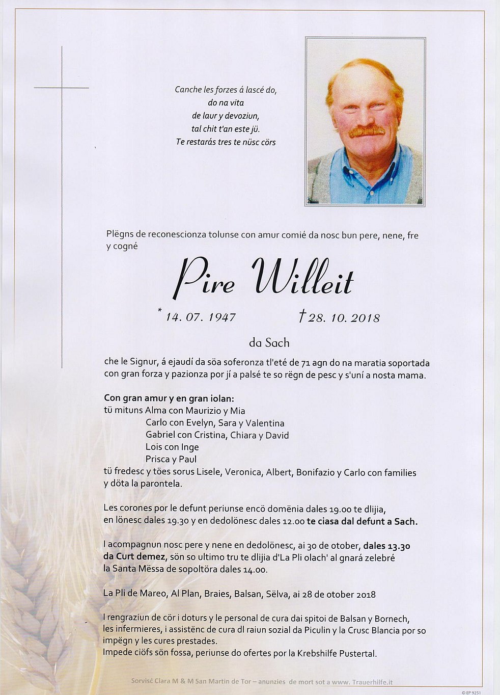 Wir begleiten unseren lieben Vater und Großvater am Dienstag, dem 30. Oktober um 13.30 Uhr von Hof/ Curt ausgehend, zum Trauergottesdienst um 14.00 Uhr in die Pfarrkirche von Enneberg und anschließend zur letzten Ruhe in den Ortsfriedhof.