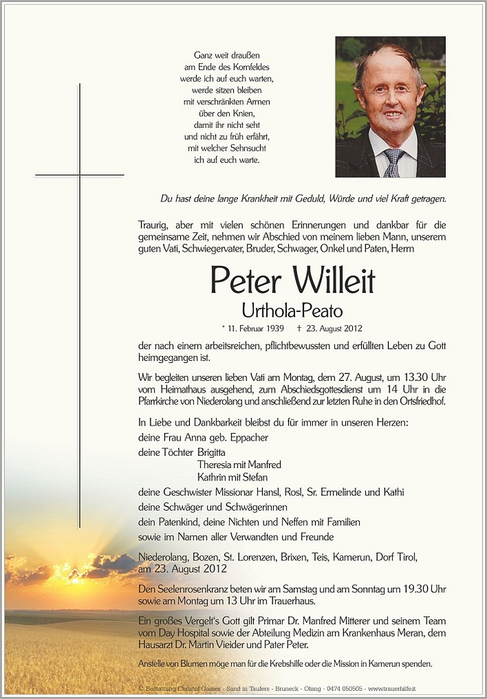 Wir begleiten unseren lieben Vati am Montag, dem 27. August, um 13.30 Uhr vom Heimathaus ausgehend, zum Abschiedsgottesdienst um 14 Uhr in die Pfarrkirche von Niederolang und anschließend zur letzten Ruhe in den Ortsfriedhof.