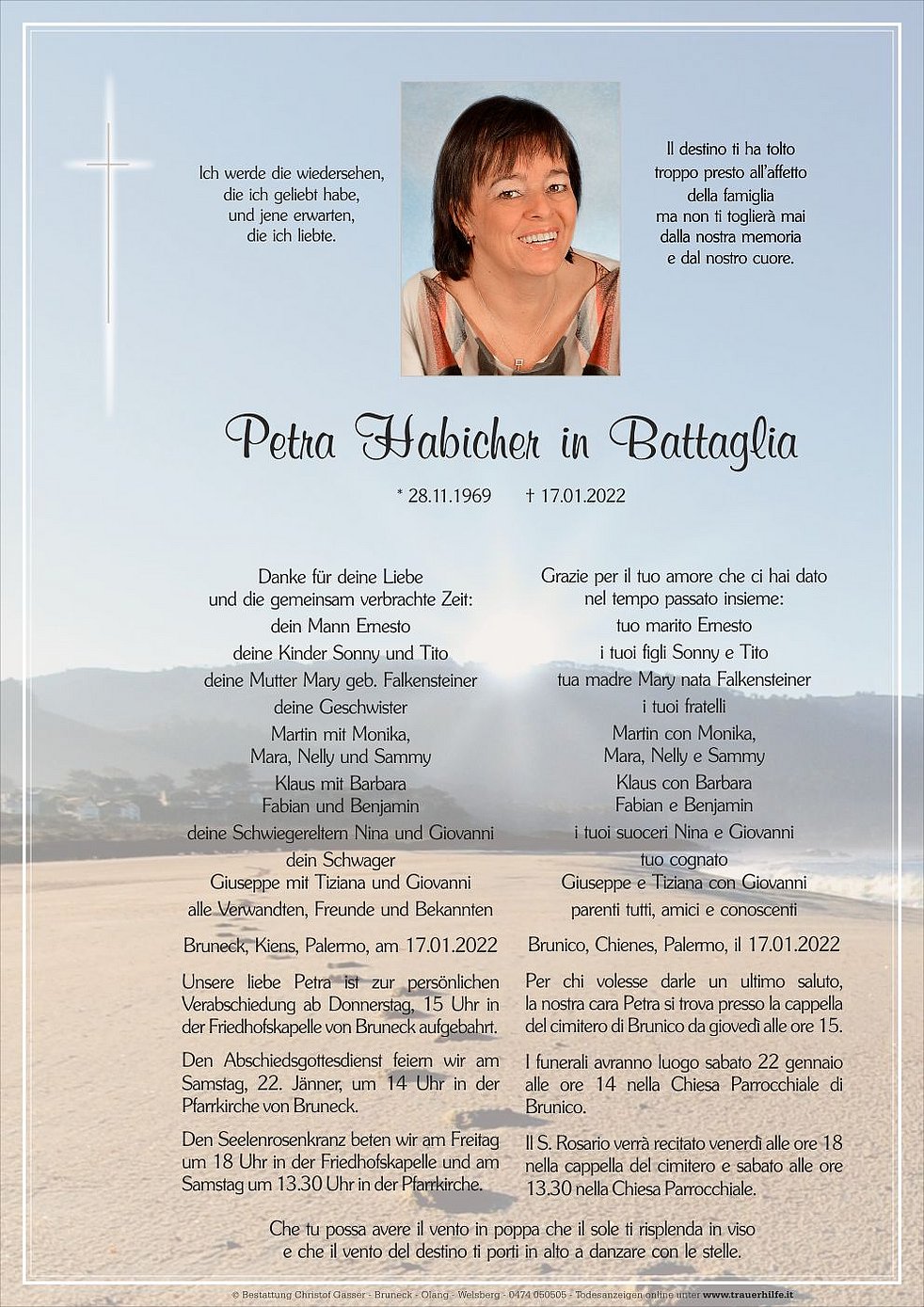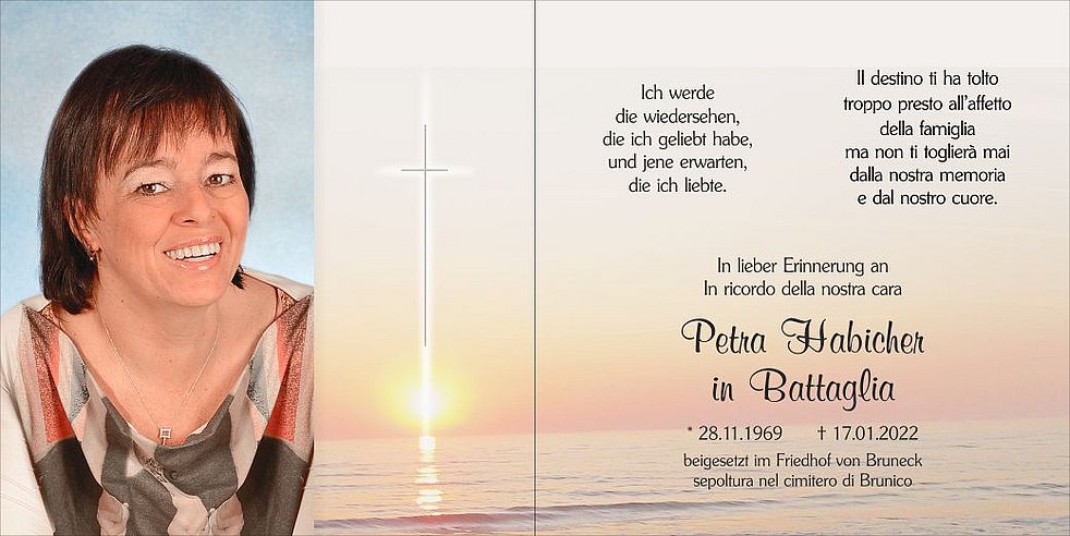 Unsere liebe Petra ist zur persönlichen Verabschiedung ab Donnerstag, 15 Uhr in der Friedhofskapelle von Bruneck aufgebahrt.