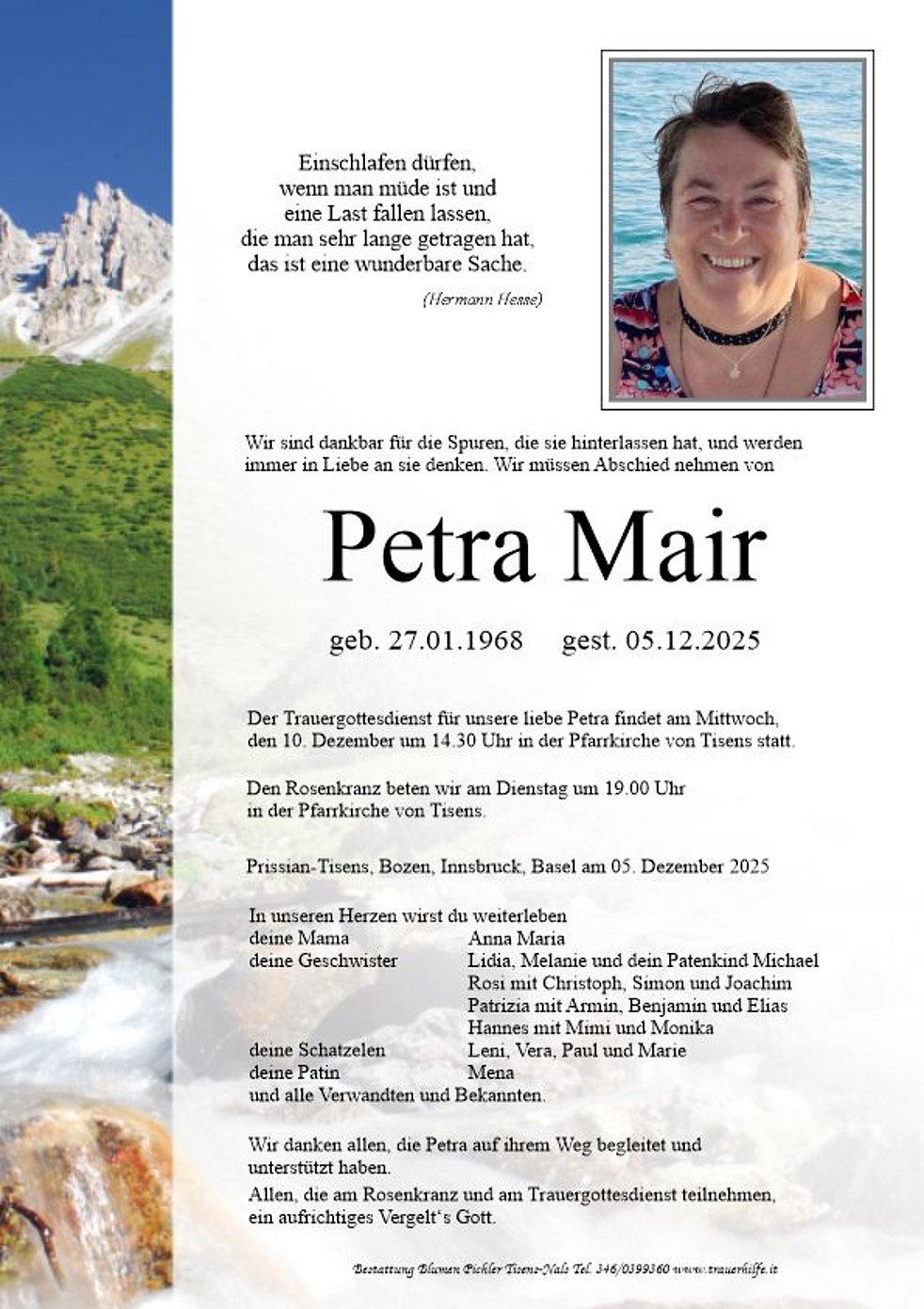 Begräbnisgottesdienst: 10.12. - 14:30 Uhr Pfarrkirche Tisens