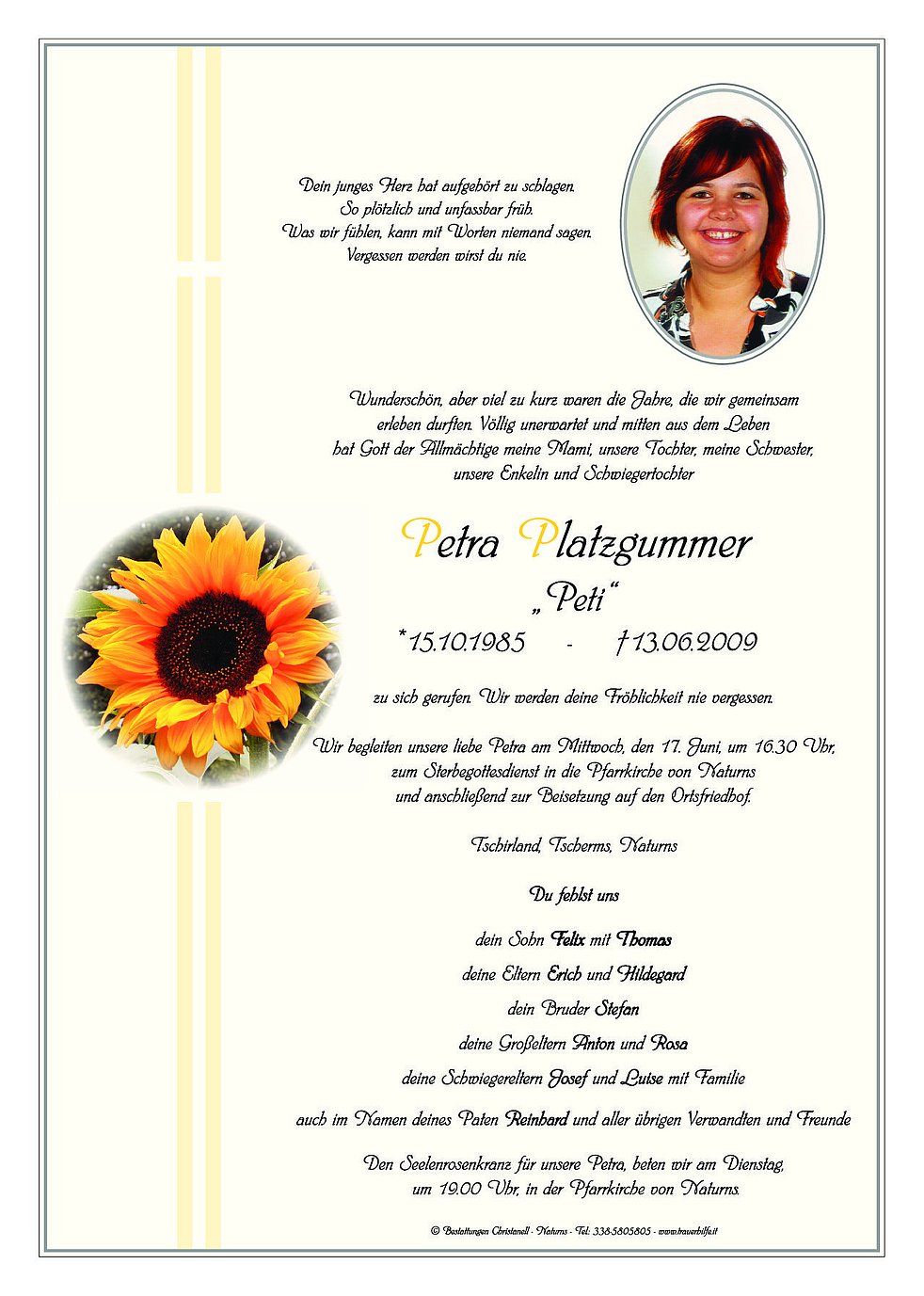 Wir begleiten unsere liebe Petra am Mittwoch, den 17. Juni, um 16.30 Uhr, zum Sterbegottesdienst in die Pfarrkirche von Naturns und anschließend zur Beisetzung auf den Ortsfriedhof.