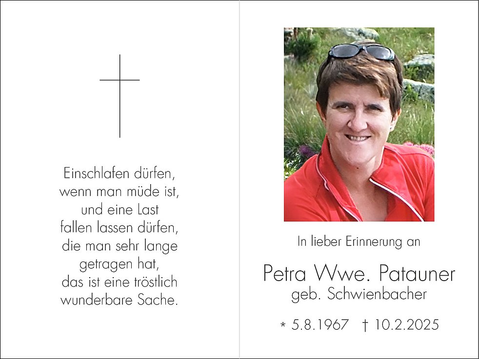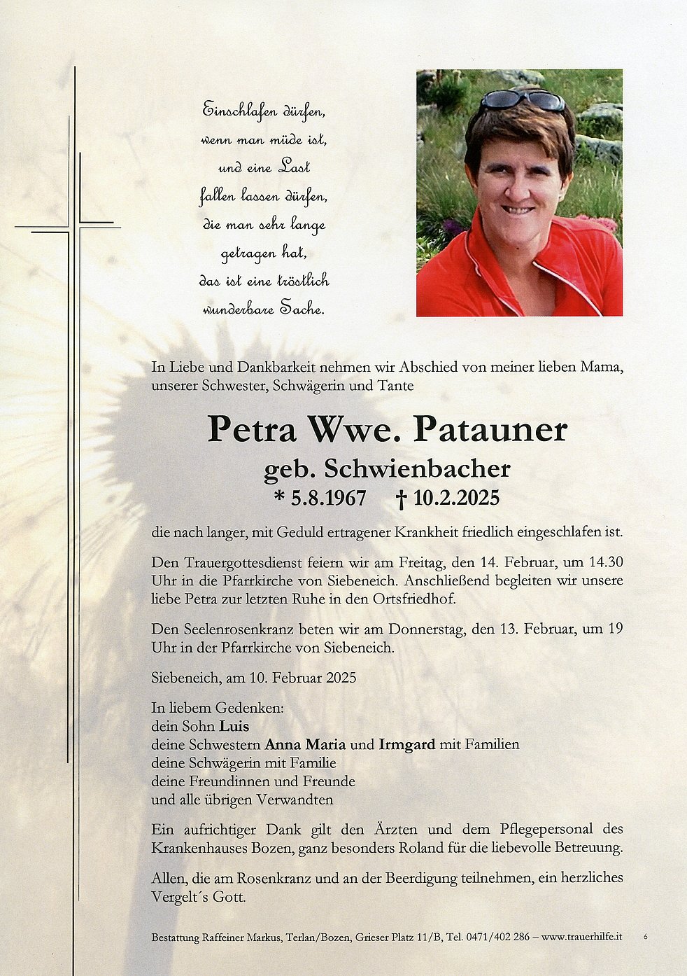 Den Trauergottesdienst feiern wir am Freitag, den 14. Februar, um 14.30 Uhr in die Pfarrkirche von Siebeneich. Anschließend begleiten wir unsere liebe Petra zur letzten Ruhe in den Ortsfriedhof.