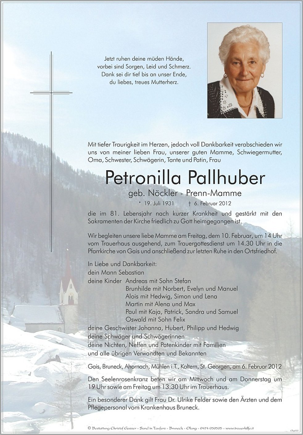 Wir begleiten unsere liebe Mamme am Freitag, dem 10. Februar, um 14 Uhr vom Trauerhaus ausgehend, zum Trauergottesdienst um 14.30 Uhr in die Pfarrkirche von Gais und anschließend zur letzten Ruhe in den Ortsfriedhof.