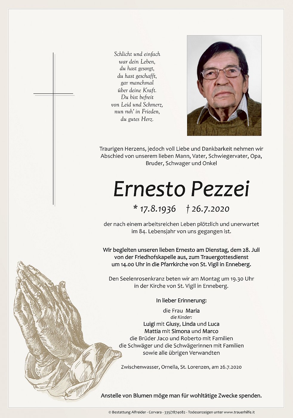 Wir begleiten unseren lieben Ernesto am Dienstag, dem 28. Juli von der Friedhofskapelle aus, zum Trauergottesdienst um 14.00 Uhr in die Pfarrkirche von St. Vigil in Enneberg.