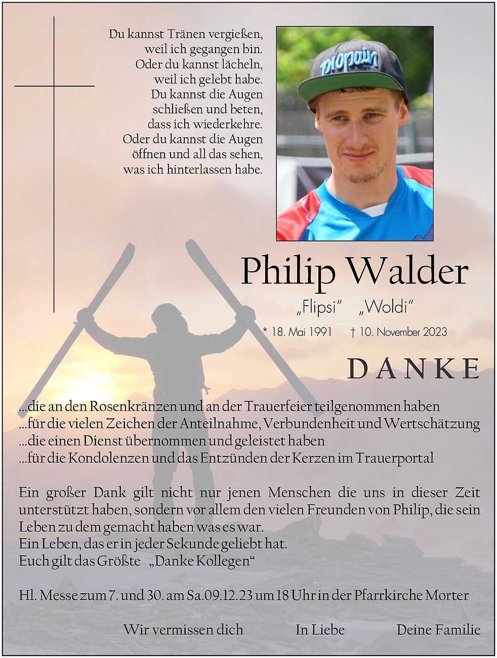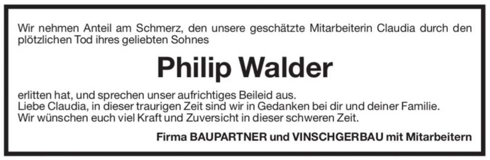 Liebe Claudia, lieber Andy, liebe Trauerfamilie, ich wünsche euch viel Kraft, Begleitung und gute Gedanken, die über diesen einen Tag hinausreichen und euch helfen mögen, diese schlimme Zeit nach diesem so plötzlichen Abschied von eurem Philip anzunehmen. Aufrichtiges Beileid