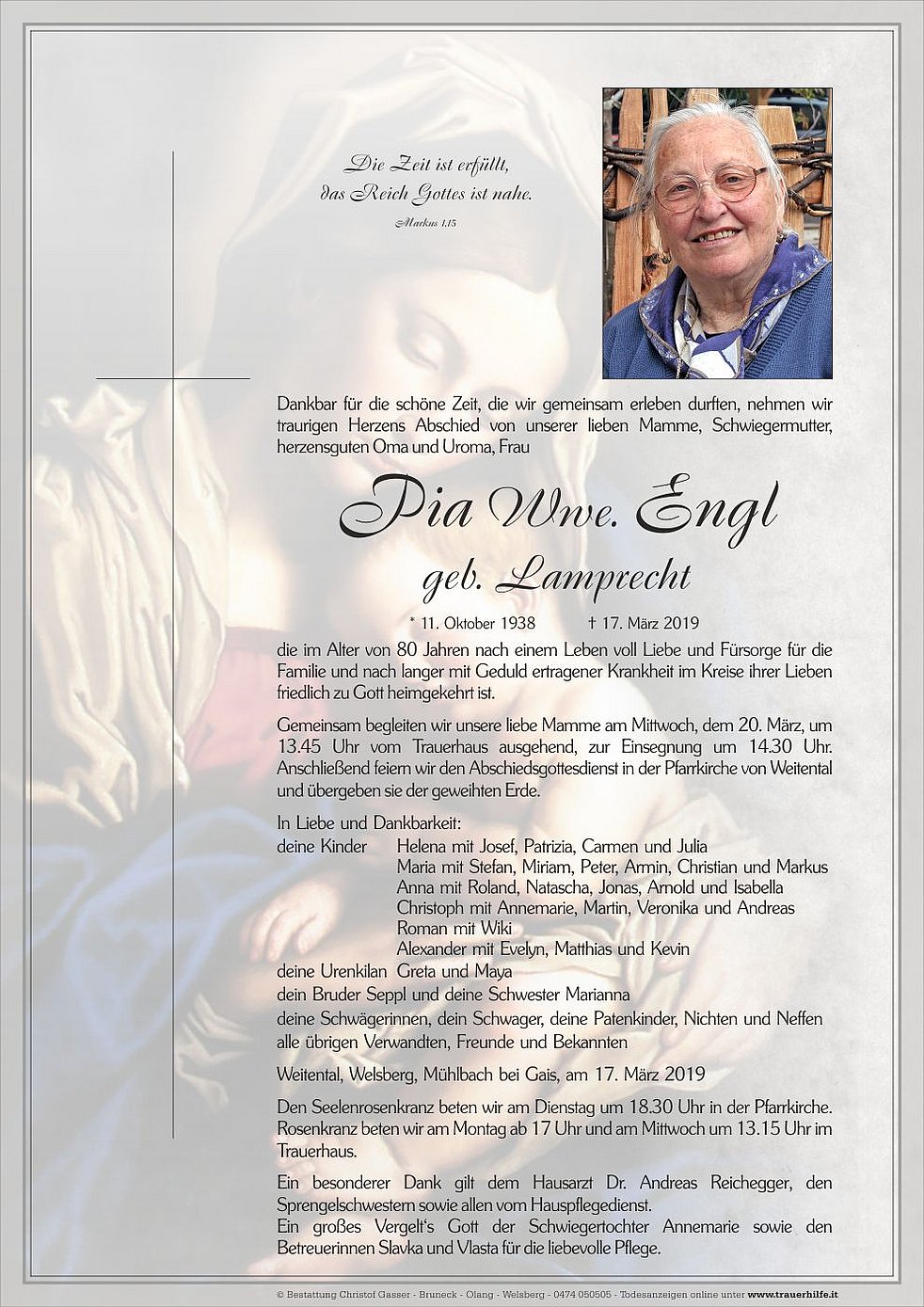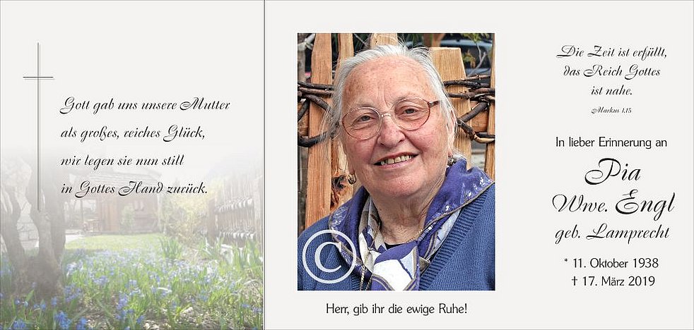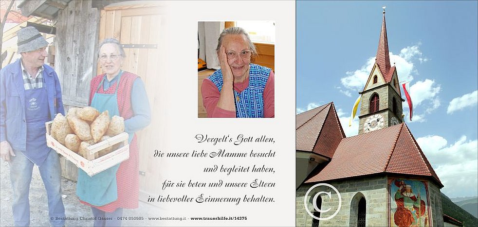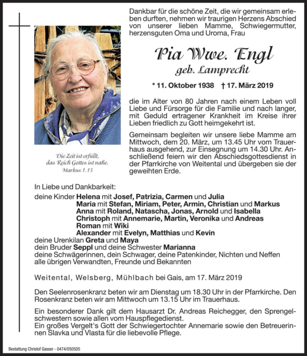 Gemeinsam begleiten wir unsere liebe Mamme am Mittwoch, dem 20. März, um 13.45 Uhr vom Trauerhaus ausgehend, zur Einsegnung um 14.30 Uhr. Anschließend feiern wir den Abschiedsgottesdienst in der Pfarrkirche von Weitental und übergeben sie der geweihten Erde.