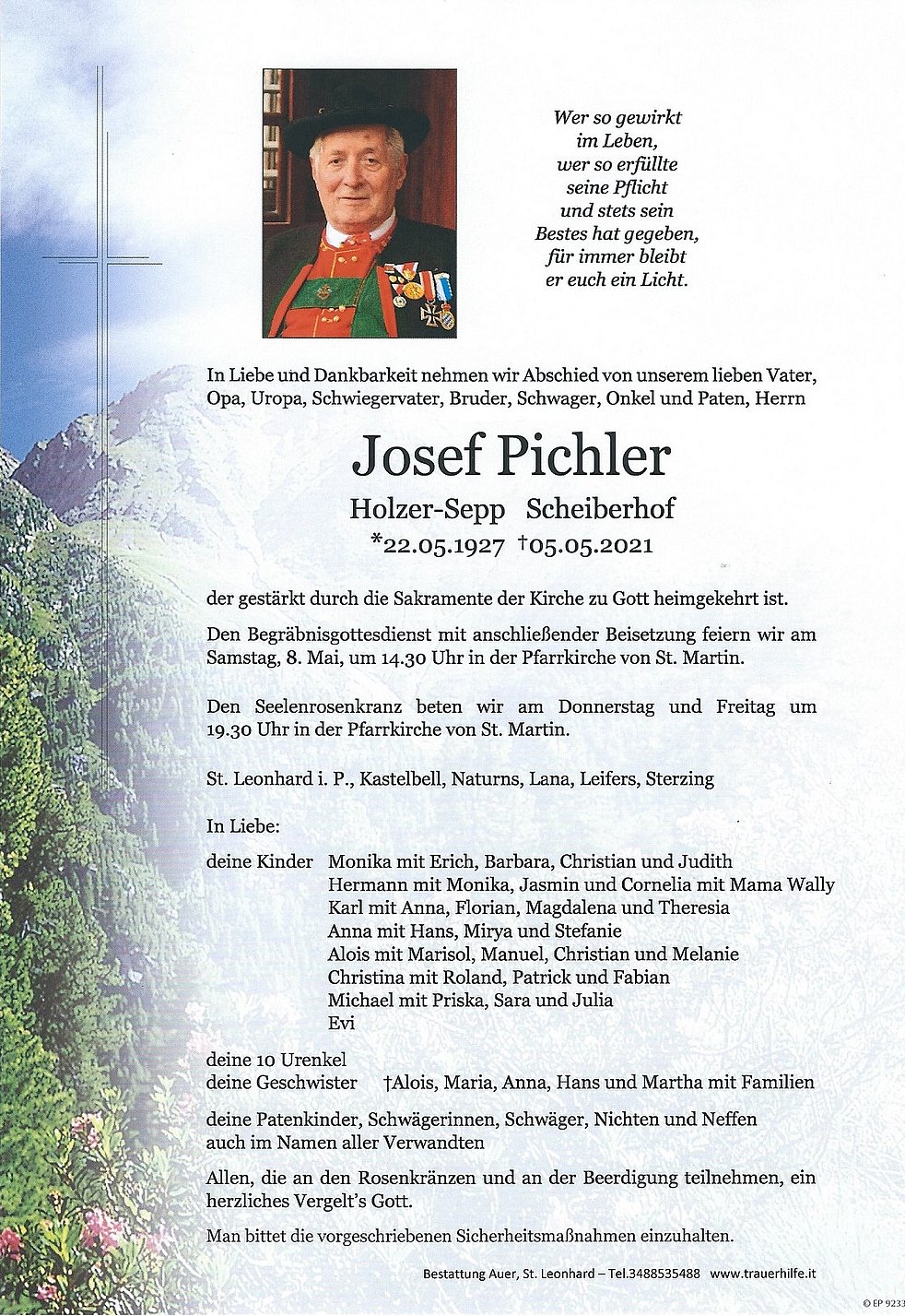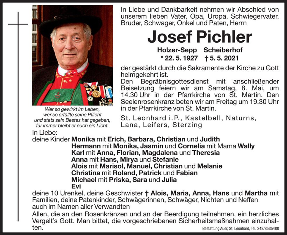 Den Begräbnisgottesdienst mit anschließender Beisetzung feiern wir am Samstag, 8. Mai, um 14.30 Uhr in der Pfarrkirche von St. Martin.