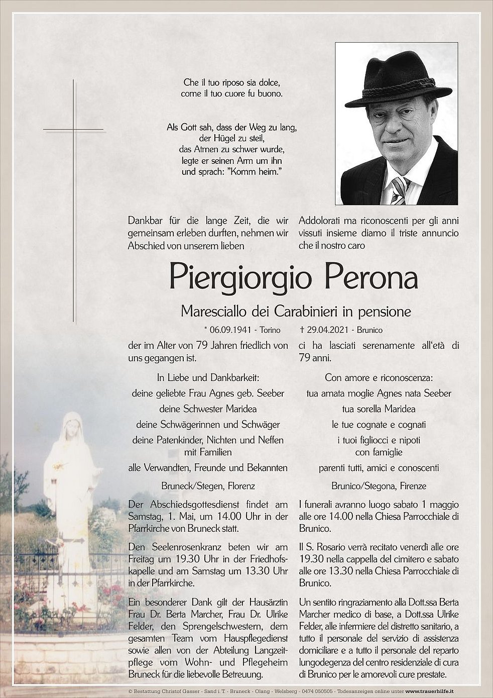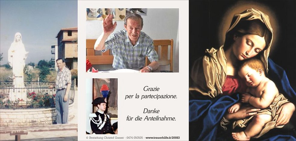 Lieber Onkel Giorgio, dein tiefer Glaube, lässt dich nun Ruhen in Gottes Händen. Dein Humor und deine interessanten Geschichten aus der Vergangenheit werden uns stets ein Lächeln auf die Lippen zaubern. Liebe Tante Agnes, es tut uns sehr leid, dass dein lieber Mann nicht mehr bei dir ist, aber er wird nun als Engel auf dich aufpassen, so wie du es in den letzten Jahren mit voller Hingabe für ihn gemacht hast.