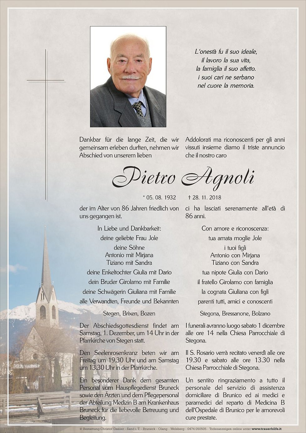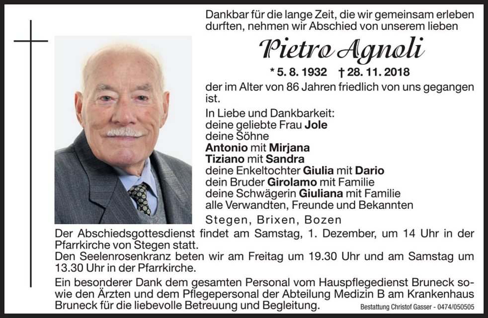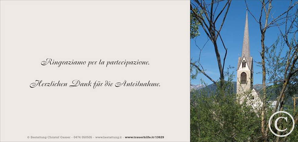 Ein besonderer Dank dem gesamten Personal vom Hauspflegedienst Bruneck sowie den Ärzten und dem Pflegepersonal der Abteilung Medizin B am Krankenhaus Bruneck für die liebevolle Betreuung und Begleitung.