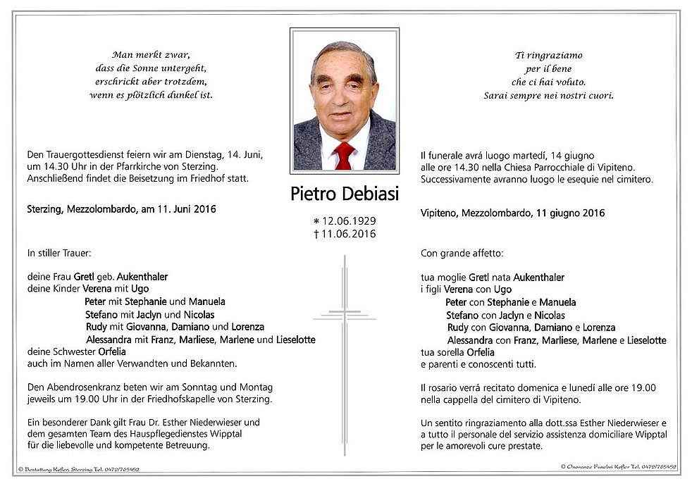 Il funerale avrá luogo martedí, 14 giugno alle ore 14.30 nella Chiesa Parrocchiale di Vipiteno. Successivamente avranno luogo le esequie nel cimitero.
