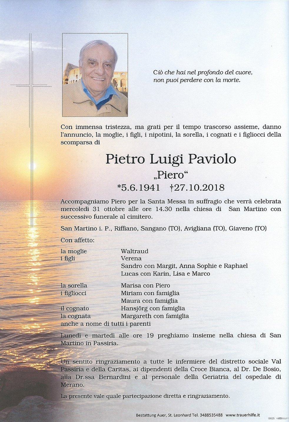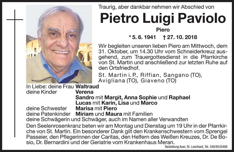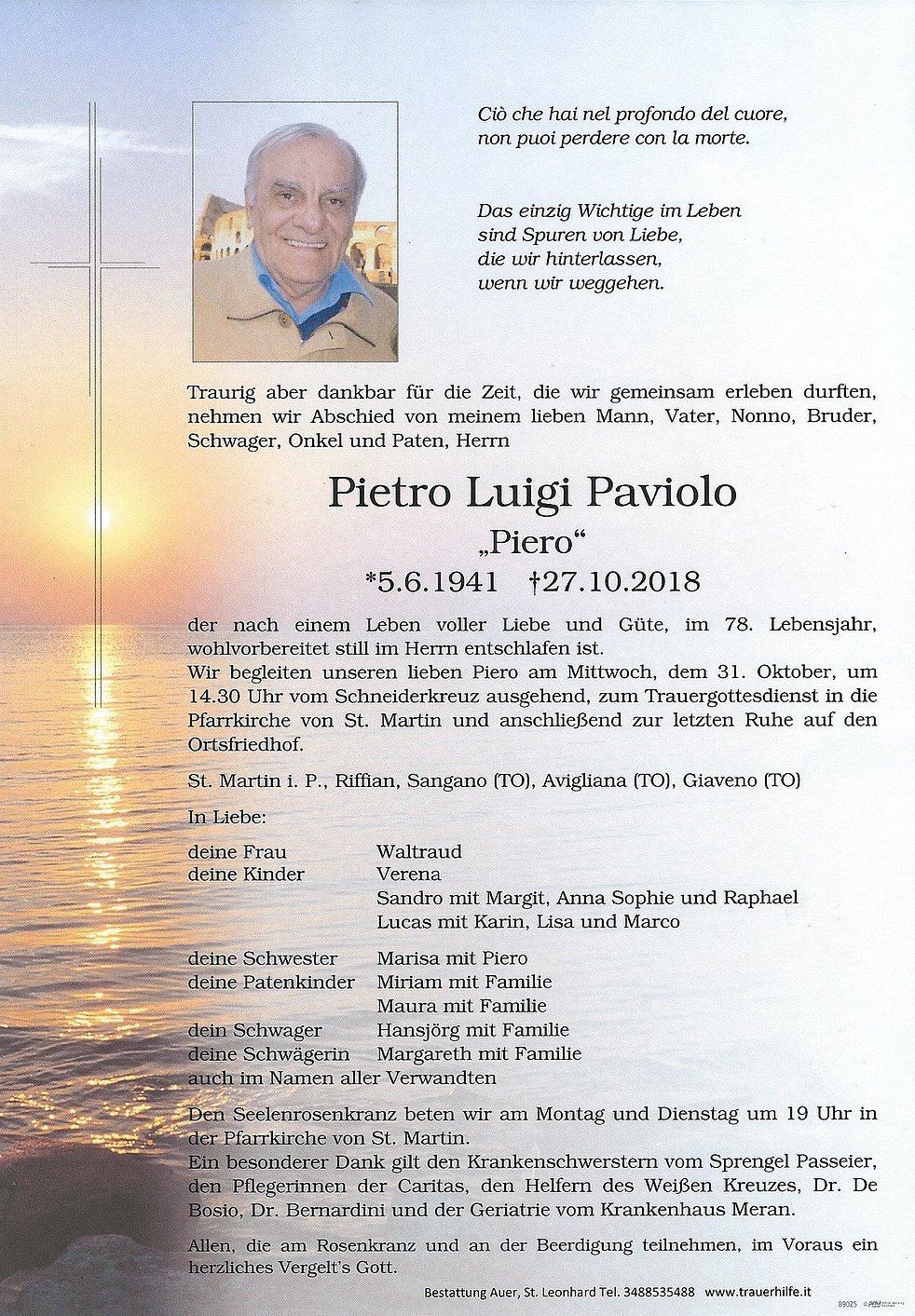 Wir begleiten unseren lieben Piero am Mittwoch, dem 31. Oktober, um 14.30 Uhr vom Schneiderkreuz ausgehend, zum Trauergottesdienst in die Pfarrkirche von St. Martin und anschließend zur letzten Ruhe auf den Ortsfriedhof.