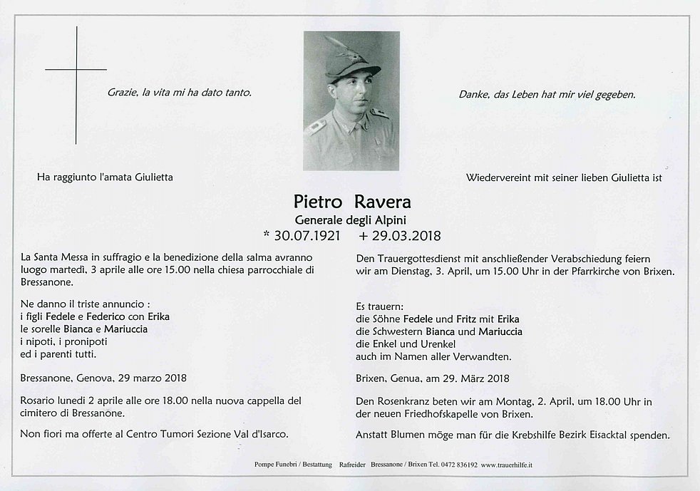 Anstatt Blumen möge man für die Krebshilfe Bezirk Eisacktal spenden.