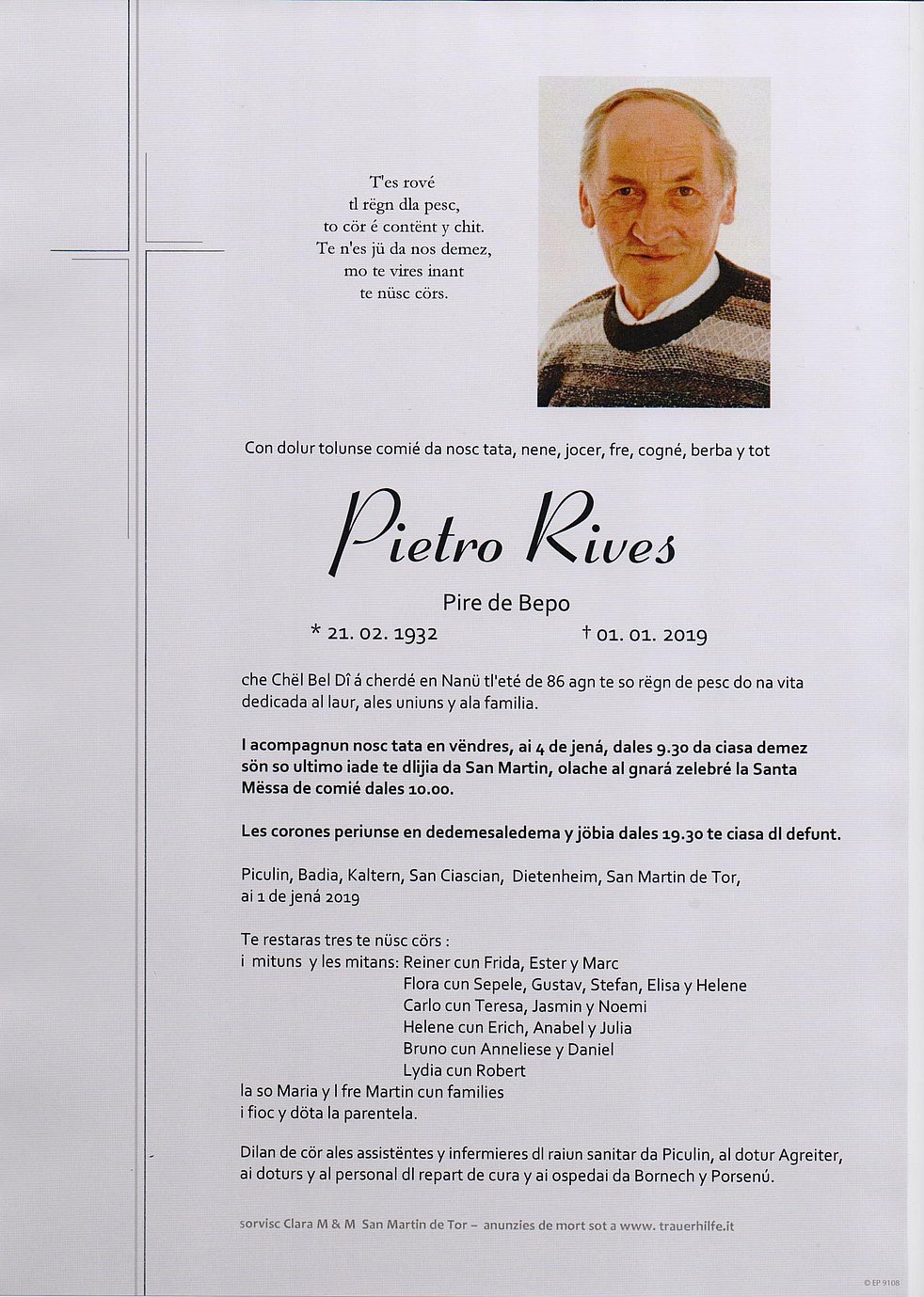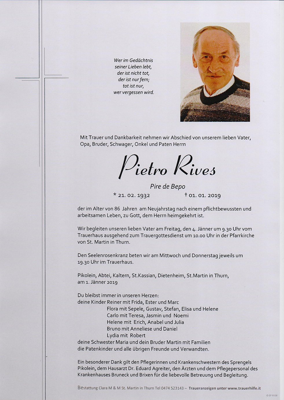 Ein besonderer Dank gilt den Pflegerinnen und Krankenschwestern des Sprengels Pikolein, dem Hausarzt Dr. Eduard Agreiter, den Ärzten und dem Pflegepersonal des Krankenhauses Bruneck und Brixen für die liebevolle Betreuung und Begleitung.