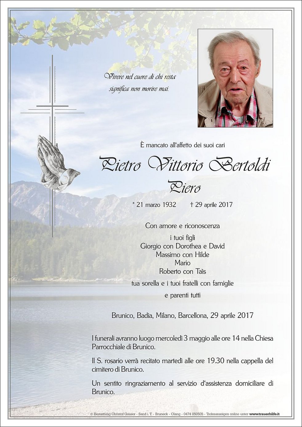 Der Trauergottesdienst findet am Mittwoch, dem 3. Mai, um 14 Uhr in der Pfarrkirche von Bruneck statt.