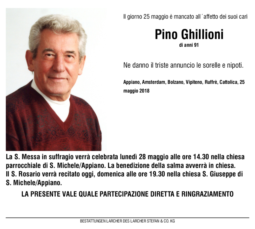 Begräbnisgottesdienst: 28.05. - 14:30 Uhr Pfarrkirche St. Michael/Eppan