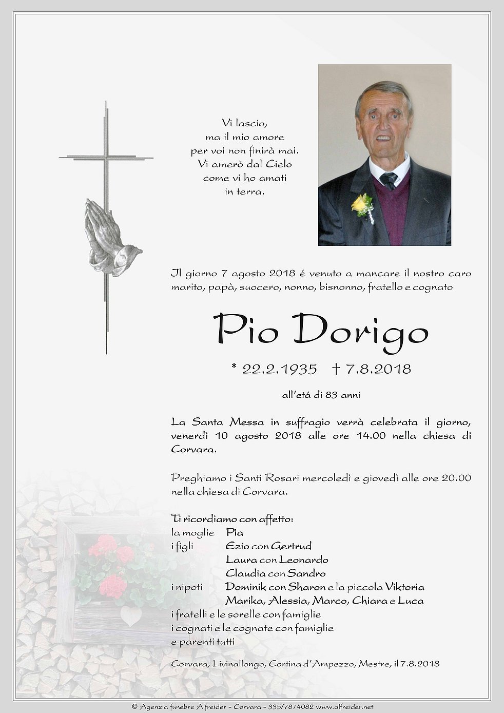 La Santa Messa in suffragio verrà celebrata il giorno, venerdì 10 agosto 2018 alle ore 14.00 nella chiesa di Corvara.