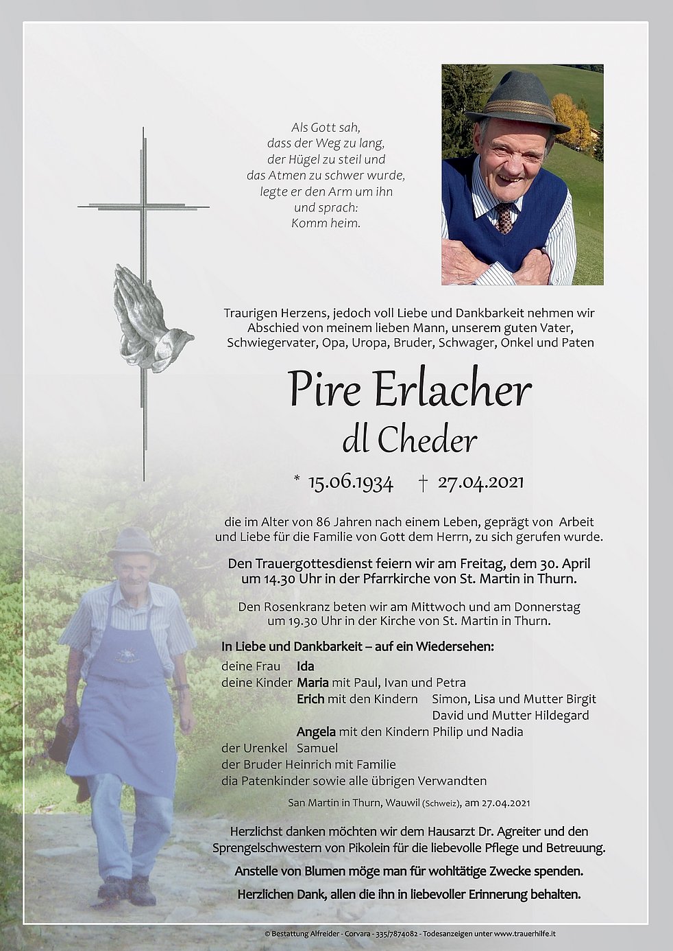 Den Trauergottesdienst feiern wir am Freitag, dem 30. April um 14.30 Uhr in der Pfarrkirche von St. Martin in Thurn.