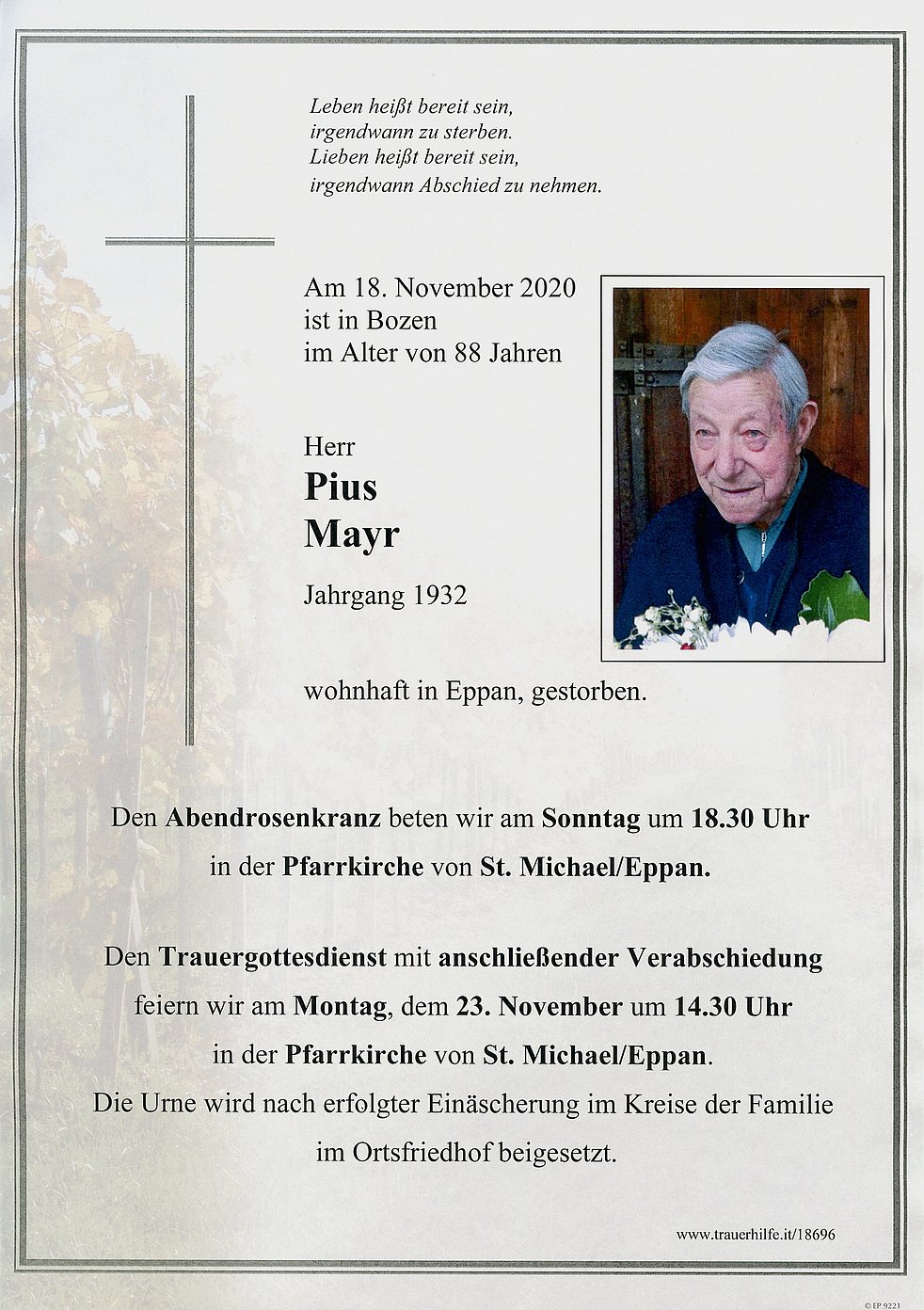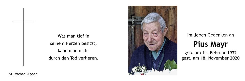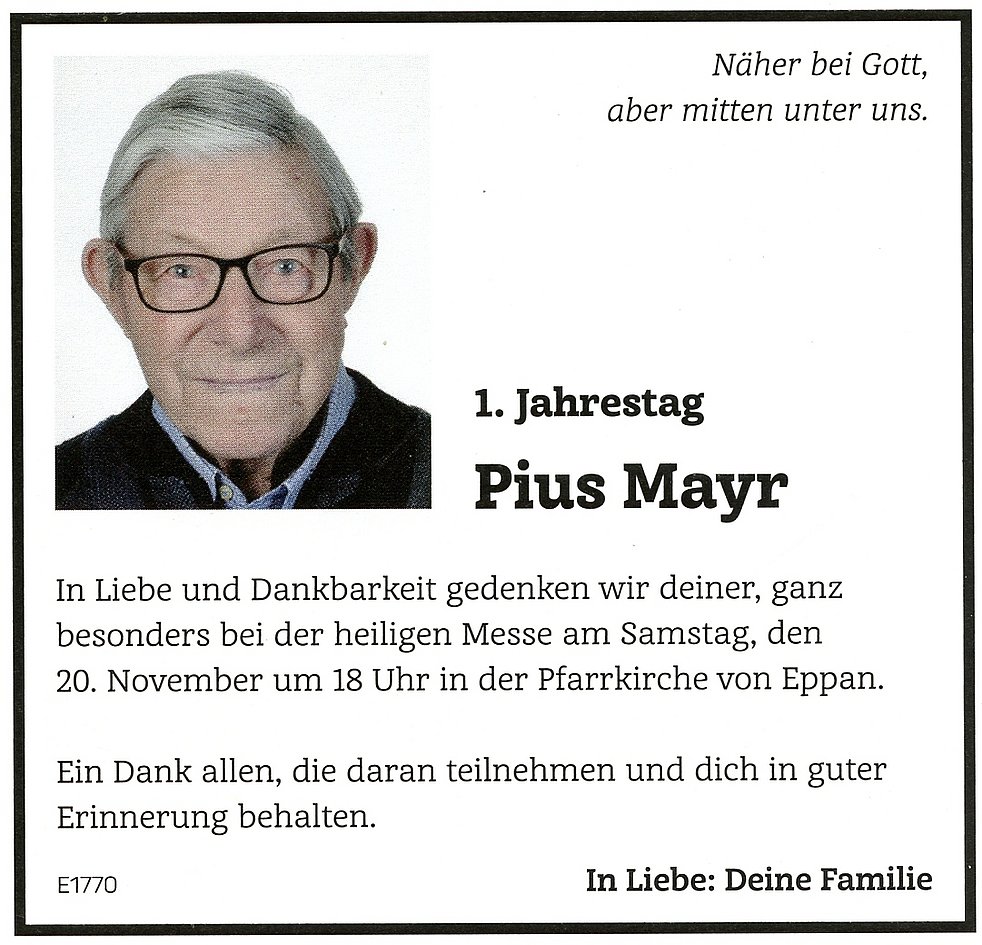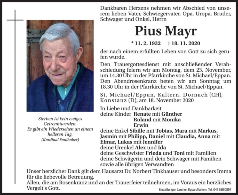 Den Trauergottesdienst mit anschließender Verabschiedung feiern wir am Montag, dem 23. November um 14.30 Uhr in der Pfarrkirche von St. Michael/Eppan.